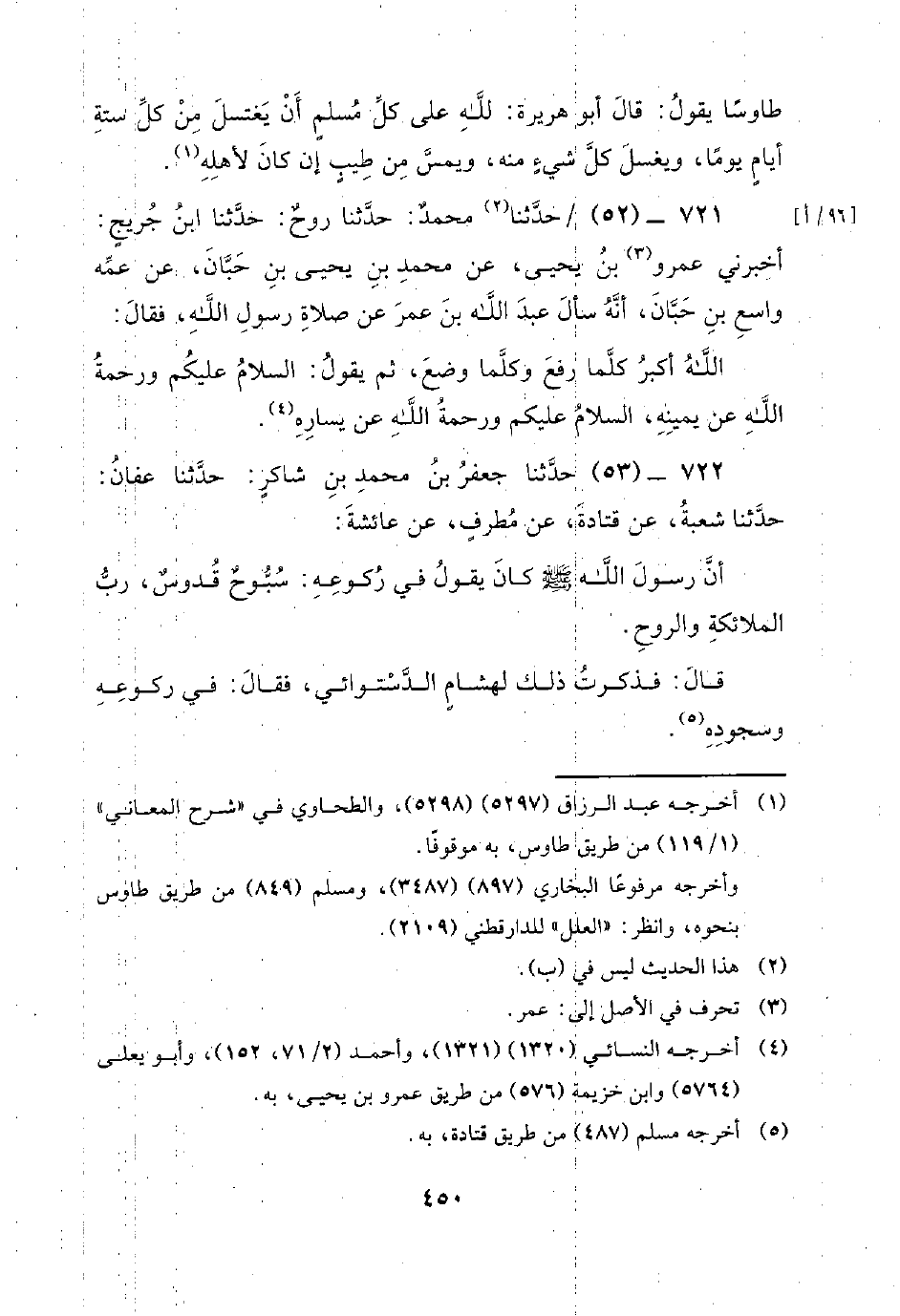 722 - (53) حدثنا جعفر بن محمد بن شاكر: حدثنا عفان: حدثنا شُعْبَةُ، عَنْ قَتَادَةَ، عَنْ مُطَرِّفٍ، عن عائشة: أن رسول الله صلى الله عَلَيْهِ وَسَلَّمَ كان يقول في ركوعه: سُبُّوحٌ قُدُّوسٌ، رَبُّ الْمَلائِكَةِ وَالرُّوحِ. قَالَ: فَذَكَرْتُ ذَلِكَ لِهِشَامٍ الدَّسْتُوَائِيِّ، فَقَالَ: فِي رُكُوعِهِ وَسُجُودِهِ.