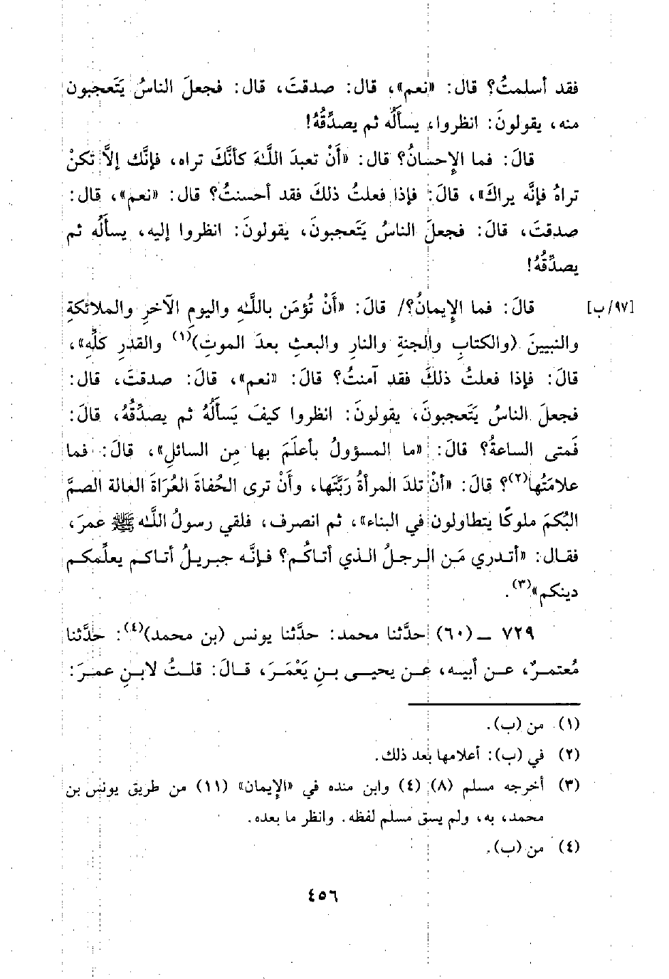 729 - (60) حَدَّثَنَا مُحَمَّدٌ: حَدَّثَنَا يُونُسُ بْنُ مُحَمَّدٍ: حَدَّثَنَا معتمر، عن أبيه، عن يحي بْنِ يَعْمُرَ، قَالَ: قُلْتُ لابْنِ عُمَرَ: -[457]- يا أبا عبد الرحمن، إن قوما يَزْعُمُونَ أَنْ لَيْسَ قَدَرٌ، قَالَ: هَلْ عِنْدَنَا مِنْهُمْ أَحَدٌ؟ قُلْتُ: لا، قَالَ: فَأَبْلِغْهُمْ عَنِّي إذا لقيتهم أن ابن عمر بريء إِلَى اللَّهِ مِنْكُمْ وَأَنْتُمْ بَرَاءٌ مِنْهُ، سَمِعْتُ عُمَرَ بْنَ الْخَطَّابِ قَالَ: بَيْنَا نَحْنُ جُلُوسٌ عِنْدَ رَسُولِ اللَّهِ فِي أُنَاسٍ [إِذْ] دَخَلَ رَجُلٌ لَيْسَ عَلَيْهِ سَحْنَاءُ سَفَرٍ وَلَيْسَ مِنْ أهل البلد يتخطى حتى ورك بين يدي رَسُولِ اللَّهِ صَلَّى اللَّهُ عَلَيْهِ وَسَلَّمَ كَمَا يَجْلِسُ أَحَدُنَا فِي الصَّلاةِ، ثُمَّ وَضَعَ يَدَهُ عَلَى رُكْبَةِ رَسُولِ اللَّهِ صَلَّى اللَّهُ عَلَيْهِ وَسَلَّمَ، فَقَالَ: يَا مُحَمَّدُ، مَا الإِسْلامُ؟ قَالَ: الإسلام أن تشهد ألا إِلَهَ إِلا اللَّهُ وَأَنَّ مُحَمَّدًا رَسُولُ اللَّهِ، وَأَنْ تُقِيمَ الصَّلاةَ، وَتُؤْتِيَ الزَّكَاةَ، وَتَحُجَّ وَتَعْتَمِرَ، وَتَغْتَسِلَ مِنَ الْجَنَابَةِ، وَتُتِمَّ الْوُضُوءَ، وَتَصُومَ رَمَضَانَ، قَالَ: فَإِنْ فَعَلْتُ هَذَا فَأَنَا مُسْلِمٌ؟ قَالَ: نَعَمْ، قَالَ: صَدَقْتَ.