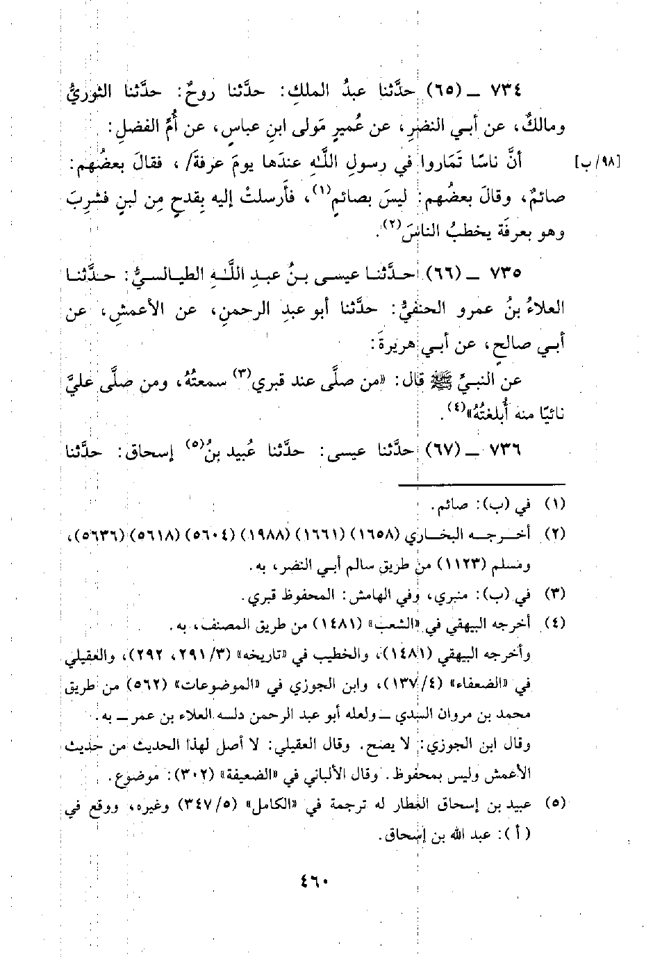 734 - (65) حدثنا عبد الملك: حدثنا روح: حَدَّثَنَا الثَّوْرِيُّ وَمَالِكٌ، عَنْ أَبِي النَّضْرِ، عَنْ عُمَيْرٍ مَوْلَى ابْنِ عَبَّاسٍ، عَنْ أُمِّ الْفَضْلِ: أَنَّ نَاسًا تَمَارَوْا فِي رَسُولِ اللَّهِ عِنْدَهَا يَوْمَ عَرَفَةَ /، فَقَالَ بَعْضُهُمْ: صَائِمٌ، وَقَالَ بَعْضُهُمْ: لَيْسَ بِصَائِمٍ، فَأَرْسَلَتْ إِلَيْهِ بِقَدَحٍ مِنْ لَبَنٍ فشرب وهو بعرفة يخطب النَّاسَ.