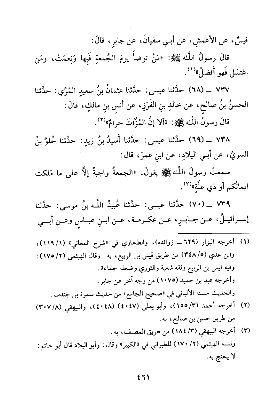738 - (69) حدثنا عيسى: حدثنا أسيد بن زيد: حَدَّثَنَا حُلْوُ بْنُ السَّرِيِّ، عَنْ أَبِي الْبِلادِ، عَنِ ابْنِ عُمَرَ، قَالَ: سَمِعْتُ رَسُولَ اللَّهِ صَلَّى اللَّهُ عَلَيْهِ وَسَلَّمَ يَقُولُ: الْجُمُعَةُ وَاجِبَةٌ إِلا عَلَى مَا مَلَكَتْ أيمانكم أو ذي علة.