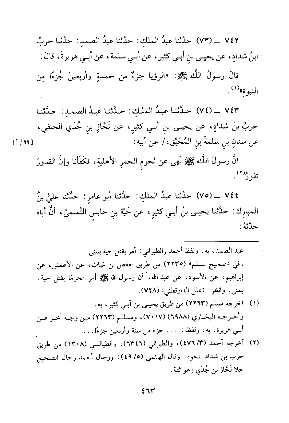 742 - (73) حَدَّثَنَا عَبْدُ الْمَلِكِ: حَدَّثَنَا عَبْدُ الصَّمَدِ: حَدَّثَنَا حَربُ بْنُ شَدَّادٍ، عَنْ يَحْيَى بْنِ أَبِي كَثِيرٍ، عَنْ أَبِي سَلَمَةَ، عَنْ أَبِي هُرَيْرَةَ، قَالَ: قَالَ رَسُولُ اللَّهِ صَلَّى اللَّهُ عَلَيْهِ وَسَلَّمَ: الرؤيا جزء من خمسة وَأَرْبَعِينَ جُزْءًا من النبوة.