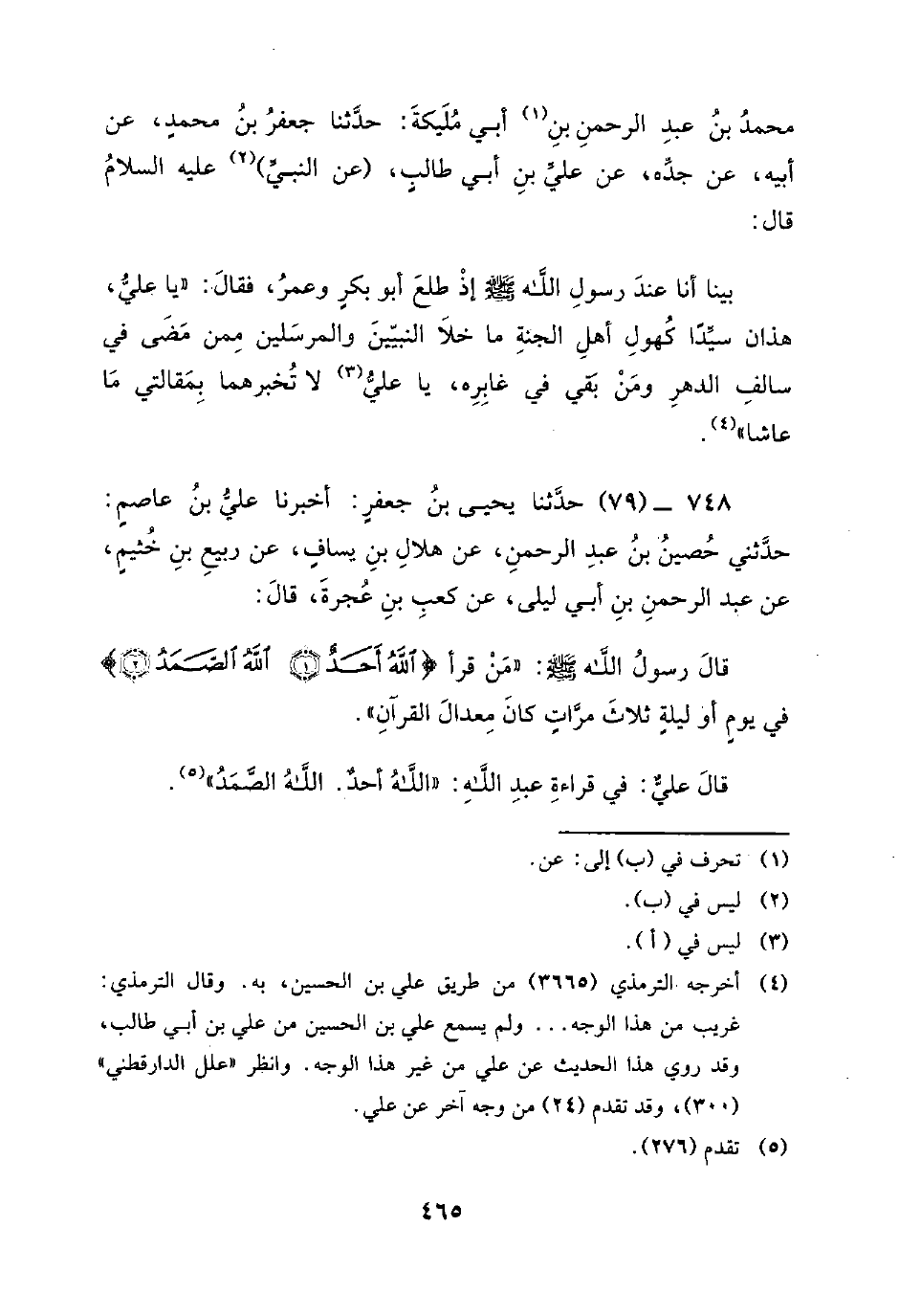 748 - (79) حَدَّثَنَا يَحْيَى بْنُ جَعْفَرٍ: أَخْبَرَنَا عَلِيُّ بْنُ عاصم: حَدَّثَنِي حُصَينُ بْنُ عَبْدِ الرَّحْمَنِ، عَنْ هِلالِ بْنِ يَسَافٍ، عَنْ رَبِيعِ بْنِ خثيَمَ، عَنْ عَبْدِ الرَّحْمَنِ بْنِ أَبِي لَيْلَى، عَنْ كَعْبِ بْنِ عُجْرَةَ، قَالَ: قَالَ رَسُولُ اللَّهِ صَلَّى اللَّهُ عَلَيْهِ وَسَلَّمَ: مَنْ قَرَأَ اللَّهُ أَحَدٌ اللَّهُ الصَّمَدُ فِي يَوْمٍ أَوْ لَيْلَةٍ ثلاث مرات كان معدال القرآن.