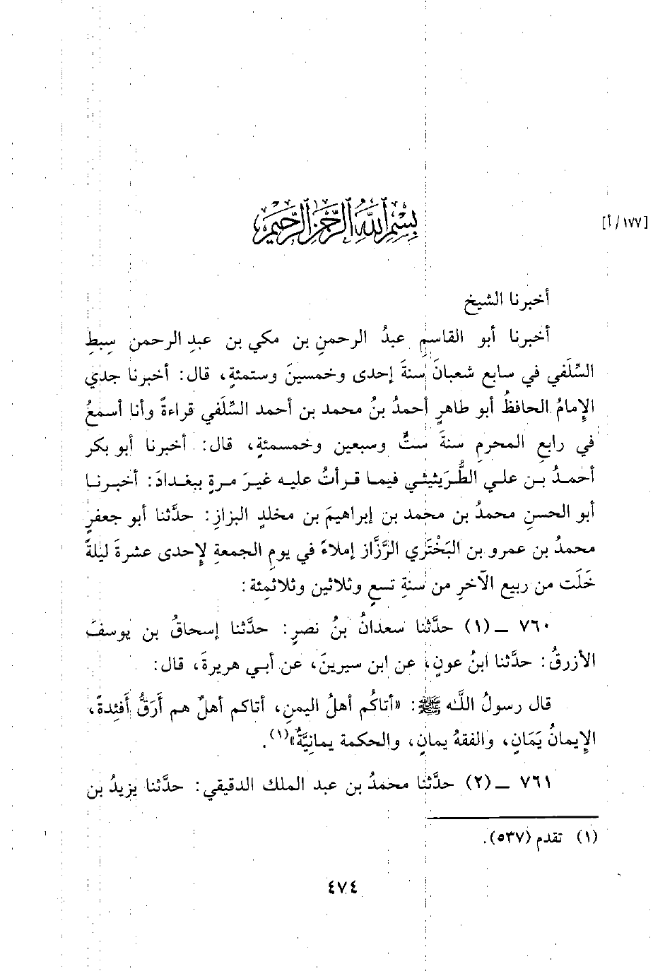 760 - (1) حَدَّثَنَا سَعْدَانُ بْنُ نَصْرٍ: حَدَّثَنَا إِسْحَاقُ بْنُ يُوسُفَ الأَزْرَقُ: حَدَّثَنَا ابْنُ عَوْنٍ، عَنِ ابْنِ سِيرِينَ، عَنْ أَبِي هُرَيْرَةَ، قَالَ: قَالَ رَسُولُ اللَّهِ صَلَّى اللَّهُ عَلَيْهِ وَسَلَّمَ: أَتَاكُمْ أَهْلُ الْيَمَنِ، أَتَاكُمْ أَهْلٌ هُمْ أَرَقُّ أَفْئِدَةً، الإِيمَانُ يَمَانٍ، وَالْفِقْهُ يَمَانٍ، وَالْحِكْمَةُ يَمَانِيَّةٌ.