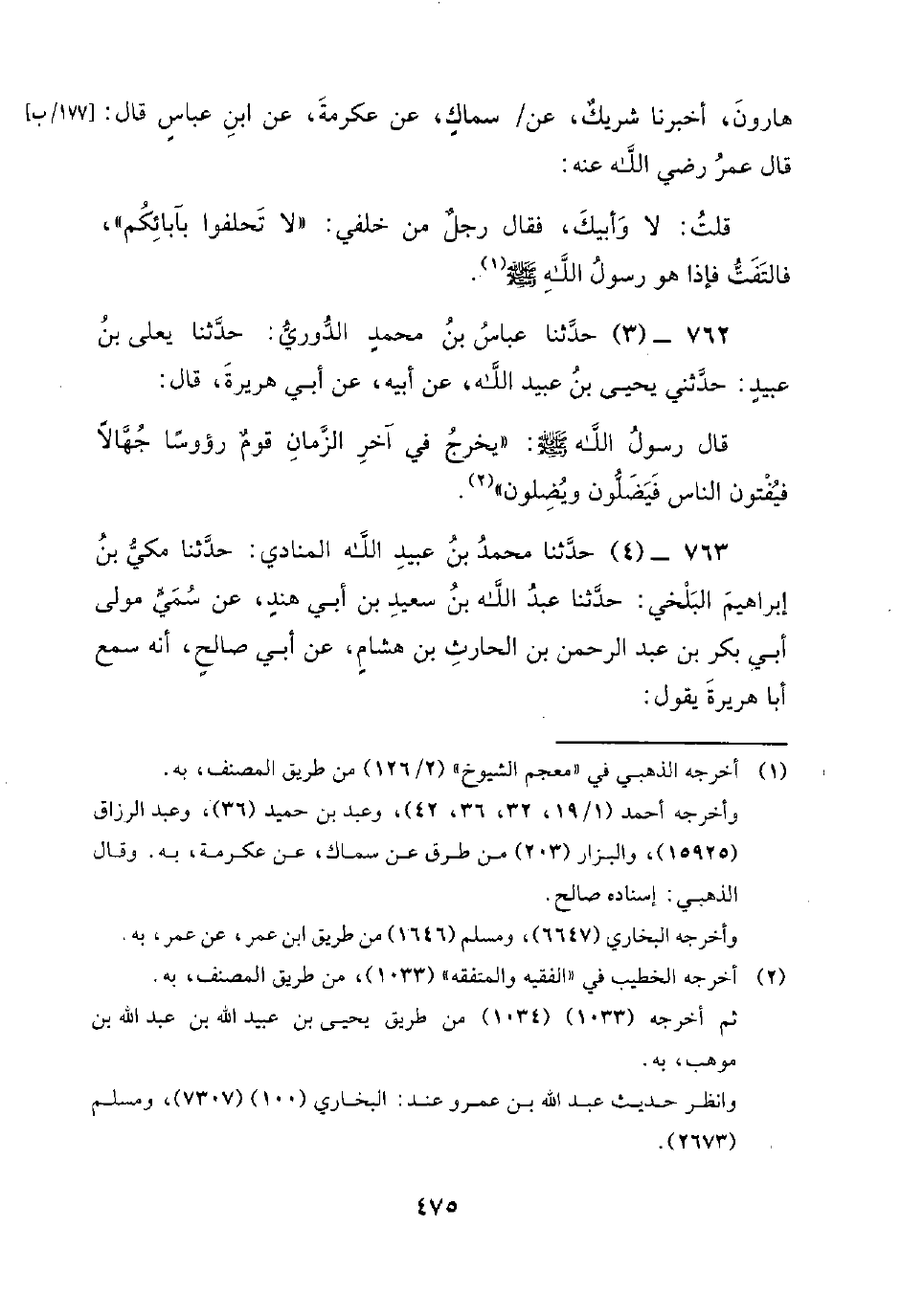 762 - (3) حَدَّثَنَا عَبَّاسُ بْنُ مُحَمَّدٍ الدُّورِيُّ: حَدَّثَنَا يَعْلَى بْنُ عُبَيْدٍ: حَدَّثَنِي يَحْيَى بْنُ عُبَيْدِ اللَّهِ، عن أبيه، عن أبي هريرة، قال: قال رَسُولُ اللَّهِ صَلَّى اللَّهُ عَلَيْهِ وَسَلَّمَ: يَخْرُجُ فِي آخِرِ الزَّمَانِ قوم رؤوسا جُهَّالا فَيُفْتُونَ النَّاسَ فَيُضِلُّونَ وَيَضِلُّونَ.