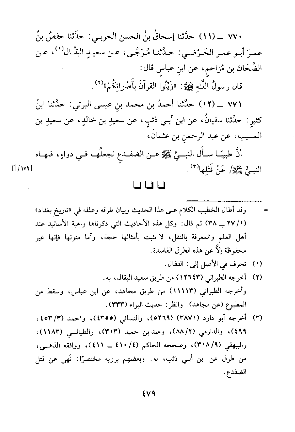 771 - (12) حَدَّثَنَا أَحْمَدُ بْنُ مُحَمَّدِ بْنِ عِيسَى الْبِرْتِيُّ: حَدَّثَنَا ابْنُ كَثِيرٍ: حَدَّثَنَا سُفْيَانُ، عَنِ ابْنِ أَبِي ذِئْبٍ، عَنْ سَعِيدِ بْنِ خَالِدٍ، عَنْ سَعِيدِ بْنِ الْمُسَيِّبِ، عَنْ عَبْدِ الرَّحْمَنِ بْنِ عُثْمَانَ، أَنَّ طَبِيبًا سَأَلَ النَّبِيَّ صَلَّى اللَّهُ عَلَيْهِ وَسَلَّمَ عَنِ الضِّفْدَعِ نَجْعَلُهَا فِي دَوَاءٍ، فَنَهَاهُ النَّبِيُّ صَلَّى اللَّهُ عَلَيْهِ وَسَلَّمَ / عَنْ قتلها.