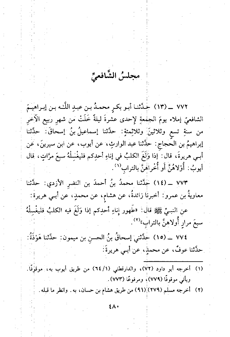 772 - (13) حَدَّثَنَا أَبُو بَكْرٍ مُحَمَّدُ بْنُ عَبْدِ اللَّهِ بْنِ إِبْرَاهِيمَ الشَّافِعِيُّ إِمْلاءً يَوْمَ الْجُمُعَةِ لإِحْدَى عَشْرَةَ لَيْلَةً خَلَتْ مِنْ شَهْرِ ربيع الآخر من سنة تسع وثلاثين وثلاثمئة: حَدَّثَنَا إِسْمَاعِيلُ بْنُ إِسْحَاقَ: حَدَّثَنَا إِبْرَاهِيمُ بْنُ الْحَجَّاجِ: حَدَّثَنَا عَبْدُ الْوَارِثِ، عَنْ أَيُّوبَ، عَنِ ابْنِ سِيرِينَ، عَنْ أَبِي هُرَيْرَةَ، قَالَ: إِذَا وَلَغَ الْكَلْبُ فِي إِنَاءِ أَحَدِكُمْ فَلْيَغْسِلْهُ سَبْعَ مرات، قال أيوب: أولاهن أو أخراهن بِالتُّرَابِ.