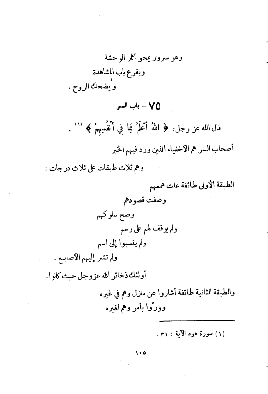 الطَّبَقَة الأولى طَائِفَة علت هممهم وصفت قصودهم وَصَحَّ سلوكهم وَلم يُوقف لَهُم على رسم وَلم ينسبوا إِلَى اسْم وَلم تشر إِلَيْهِم الْأَصَابِع