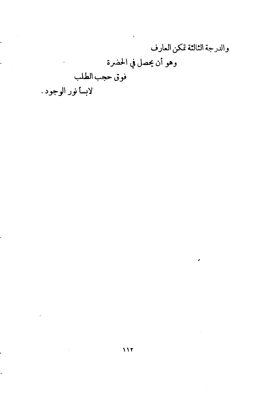 والدرجة الثَّالِثَة تمكن الْعَارِف وَهُوَ أَن يحصل فِي الحضرة فَوق حجب الطّلب لابسا نور الْوُجُود