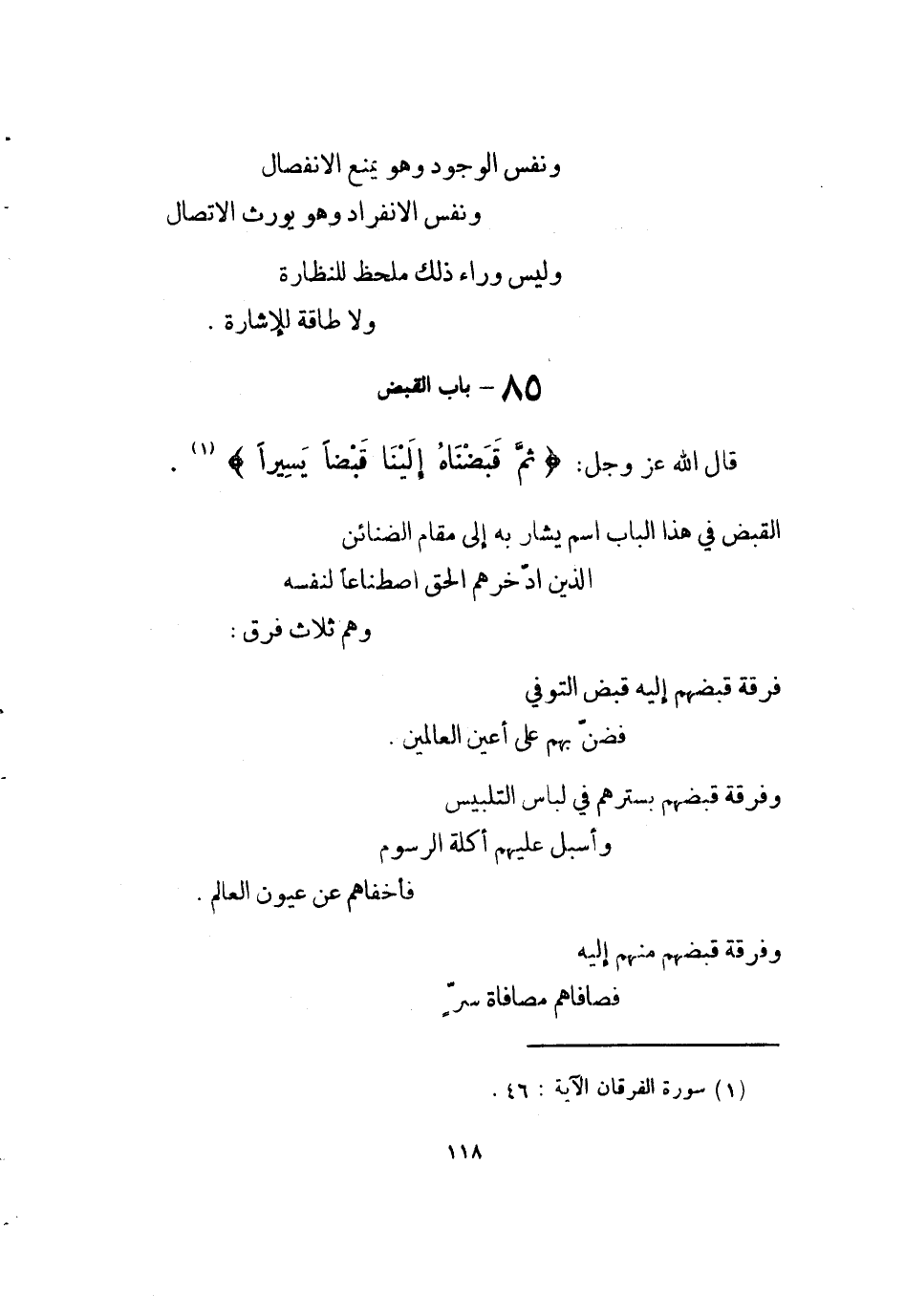 وَنَفس الْوُجُود وَهُوَ يمْنَع الِانْفِصَال وَنَفس الِانْفِرَاد وَهُوَ يُورث الِاتِّصَال وَلَيْسَ وَرَاء ذَلِك ملحظ للنظارة وَلَا طَاقَة للْإِشَارَة