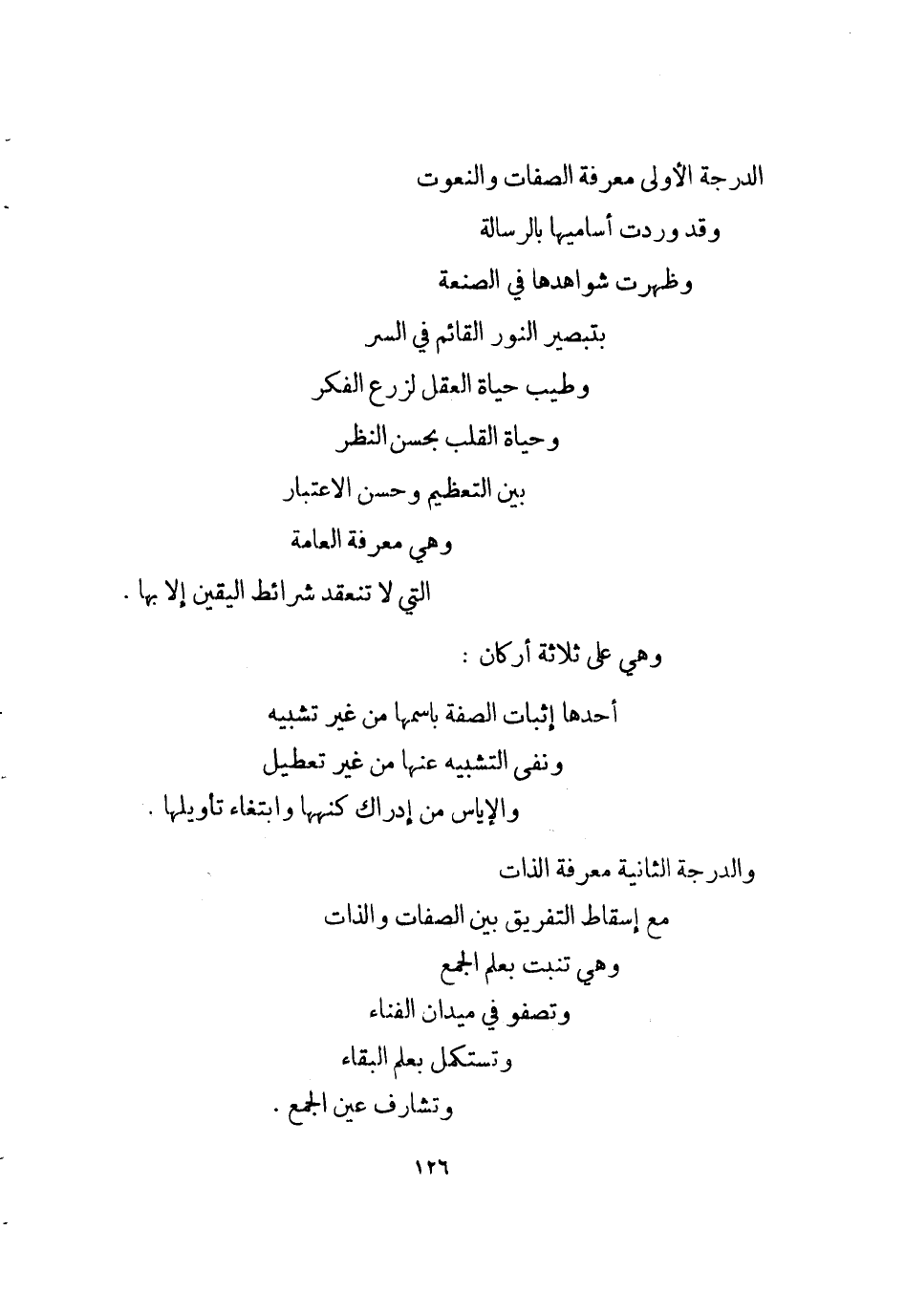الدرجَة الأولى معرفَة الصِّفَات والنعوت وَقد وَردت أساميها بالرسالة وَظَهَرت شواهدها فِي الصَّنْعَة بتبصير النُّور الْقَائِم فِي السِّرّ وَطيب حَيَاة الْعقل لزرع الْفِكر وحياة الْقلب بِحسن النّظر بَين التَّعْظِيم وَحسن الِاعْتِبَار وَهِي معرفَة الْعَامَّة الَّتِي لَا تَنْعَقِد شَرَائِط الْيَقِين إِلَّا بهَا