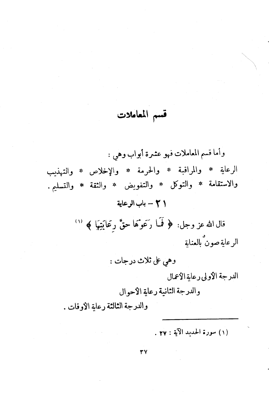 الرِّعَايَة صون بالعناية وَهِي على ثَلَاث دَرَجَات الدرجَة الأولى رِعَايَة الْأَعْمَال والدرجة الثَّانِيَة رِعَايَة الْأَحْوَال والدرجة الثَّالِثَة رِعَايَة الْأَوْقَات