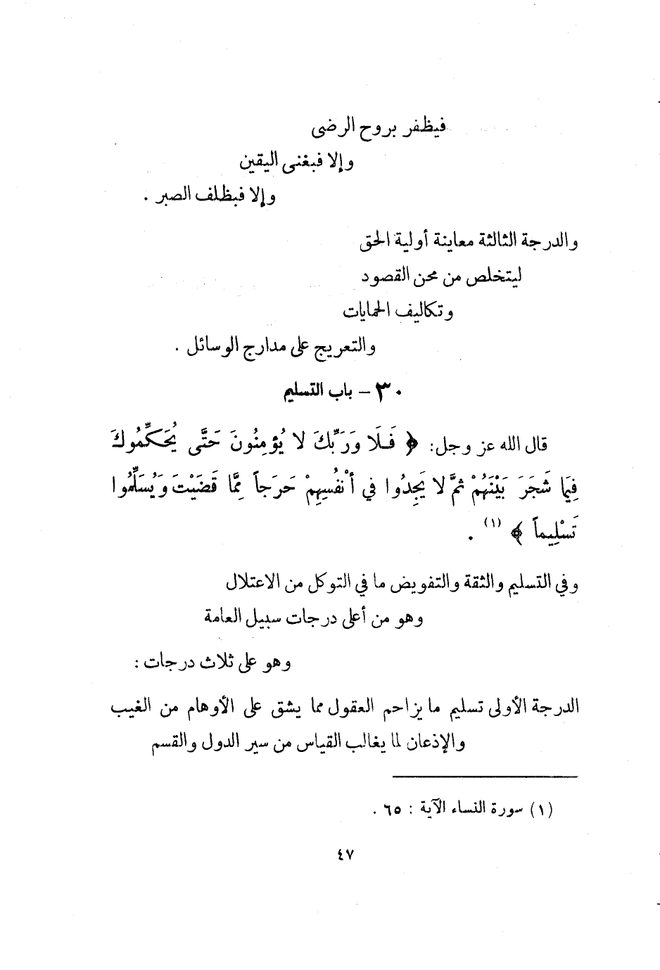 الدرجَة الأولى تَسْلِيم مَا يزاحم الْعُقُول مِمَّا يشق على الأوهام من الْغَيْب والإذعان لما يغالب الْقيَاس من سير الدول وَالْقسم