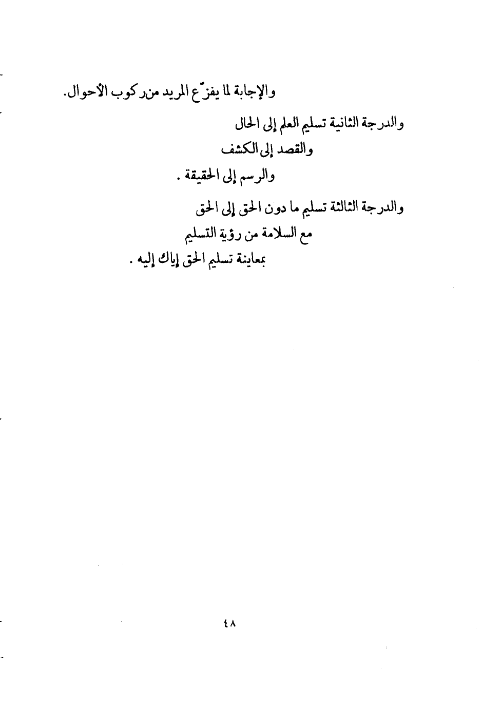 والدرجة الثَّالِثَة تَسْلِيم مَا دون الْحق إِلَى الْحق مَعَ السَّلامَة من رُؤْيَة التَّسْلِيم بمعاينة تَسْلِيم الْحق إياك إِلَيْهِ