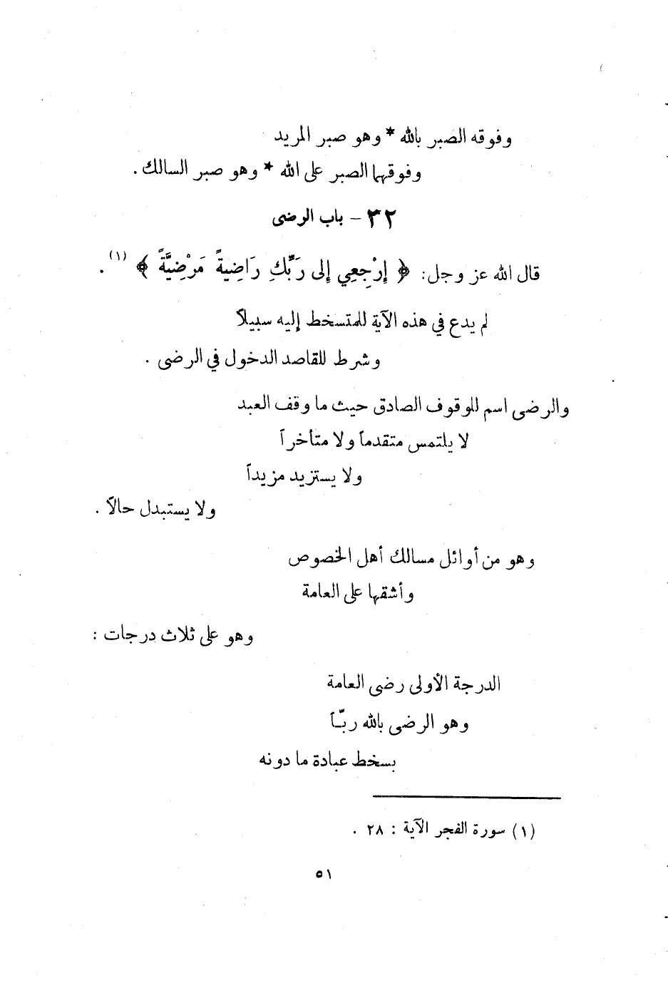 وَهُوَ من أَوَائِل مسالك أهل الْخُصُوص وأشقها على الْعَامَّة وَهُوَ على ثَلَاث دَرَجَات الدرجَة الأولى رضى الْعَامَّة وَهُوَ الرضى بِاللَّه رَبًّا بسخط عبَادَة مَا دونه