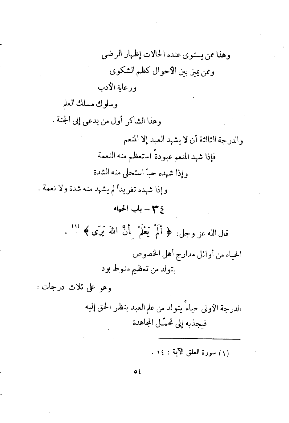 الدرجَة الأولى حَيَاء يتَوَلَّد من علم العَبْد بِنَظَر الْحق إِلَيْهِ فيجذبه إِلَى تحمل المجاهدة
