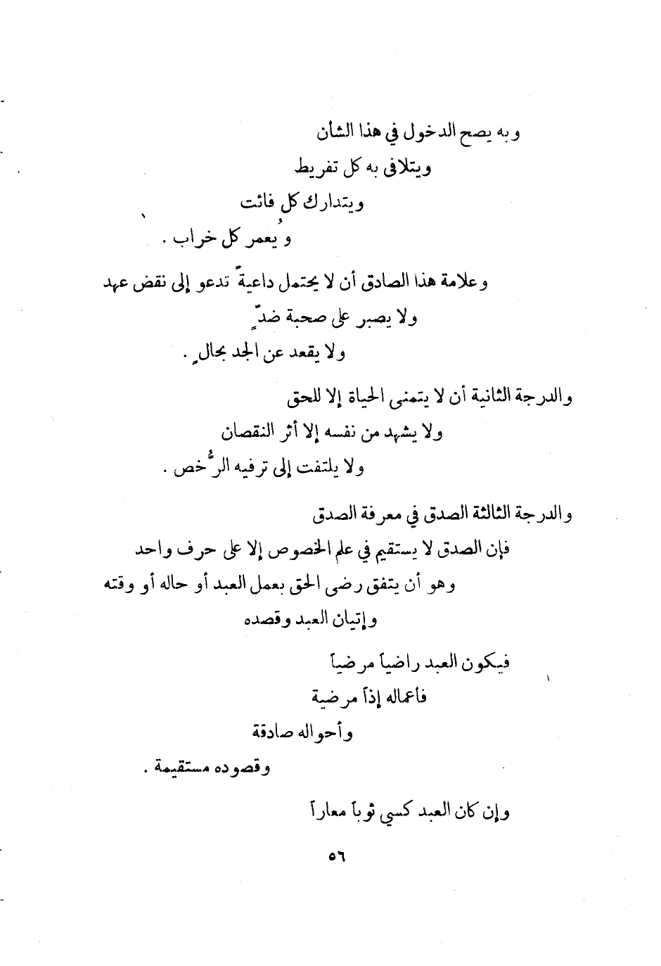 والدرجة الثَّالِثَة الصدْق فِي معرفَة الصدْق فَإِن الصدْق لَا يَسْتَقِيم فِي علم الْخُصُوص إِلَّا على حرف وَاحِد وَهُوَ أَن يتَّفق رضى الْحق بِعَمَل العَبْد أَو حَاله أَو وقته وإتيان العَبْد وقصده فَيكون العَبْد رَاضِيا مرضيا فأعماله إِذا مرضية وأحواله صَادِقَة وقصوده مُسْتَقِيمَة