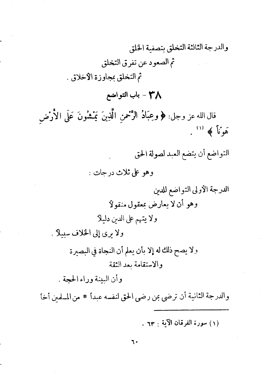 الدرجَة الأولى التَّوَاضُع للدّين وَهُوَ أَن لَا يُعَارض بمعقول مَنْقُولًا وَلَا يتهم على الدّين دَلِيلا وَلَا يرى إِلَى الْخلاف سَبِيلا