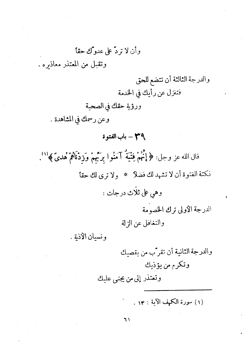 نُكْتَة الفتوة أَن لَا تشهد لَك فضلا وَلَا ترى لَك حَقًا وَهِي على ثَلَاث دَرَجَات
