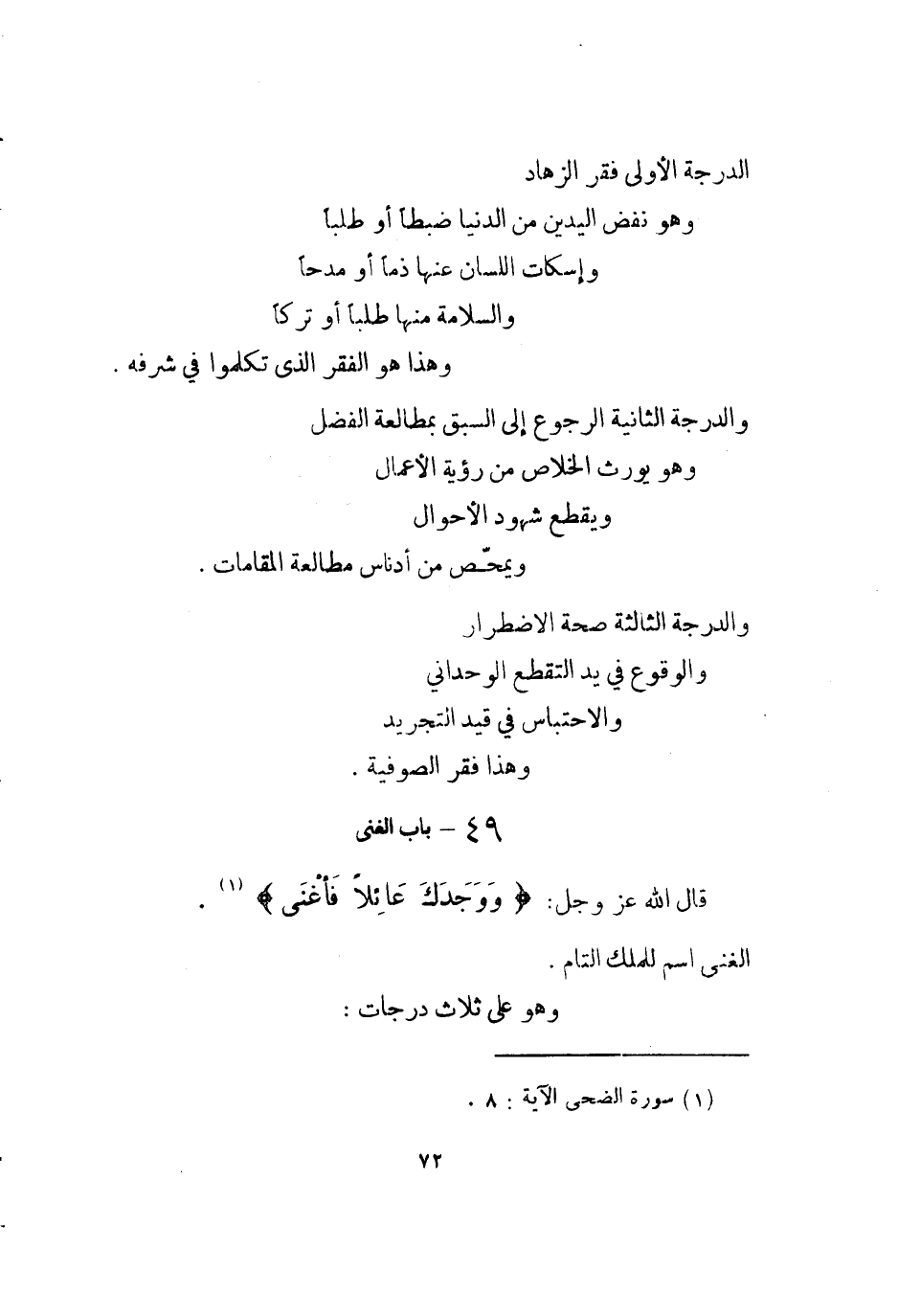 الدرجَة الأولى فقر الزهاد وَهُوَ نفض الْيَدَيْنِ من الدُّنْيَا ضبطا أَو طلبا وإسكات اللِّسَان عَنْهَا ذما أَو مدحا والسلامة مِنْهَا طلبا أَو تركا وَهَذَا هُوَ الْفقر الَّذِي تكلمُوا فِي شرفه