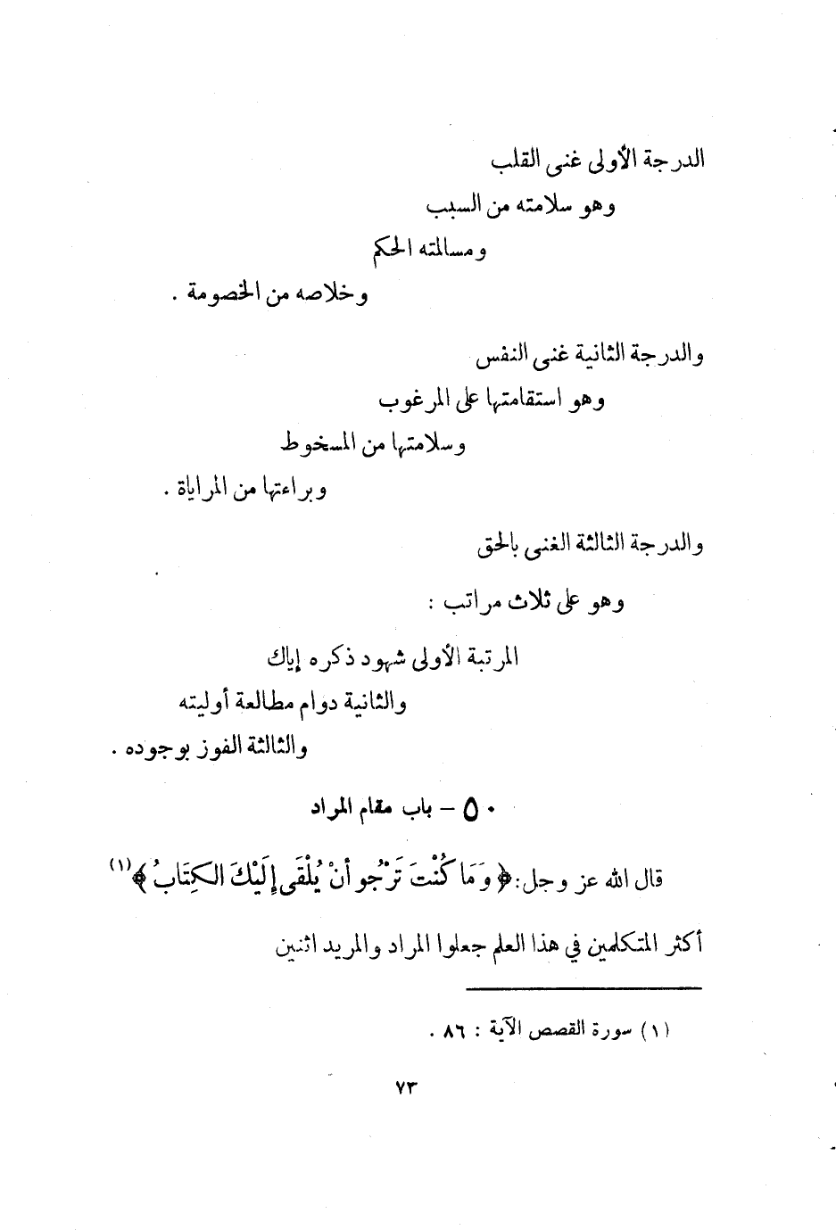 الْمرتبَة الأولى شُهُود ذكره إياك وَالثَّانيَِة دوَام مطالعة أوليته وَالثَّالِثَة الْفَوْز بِوُجُودِهِ 50 بَاب مقَام المُرَاد