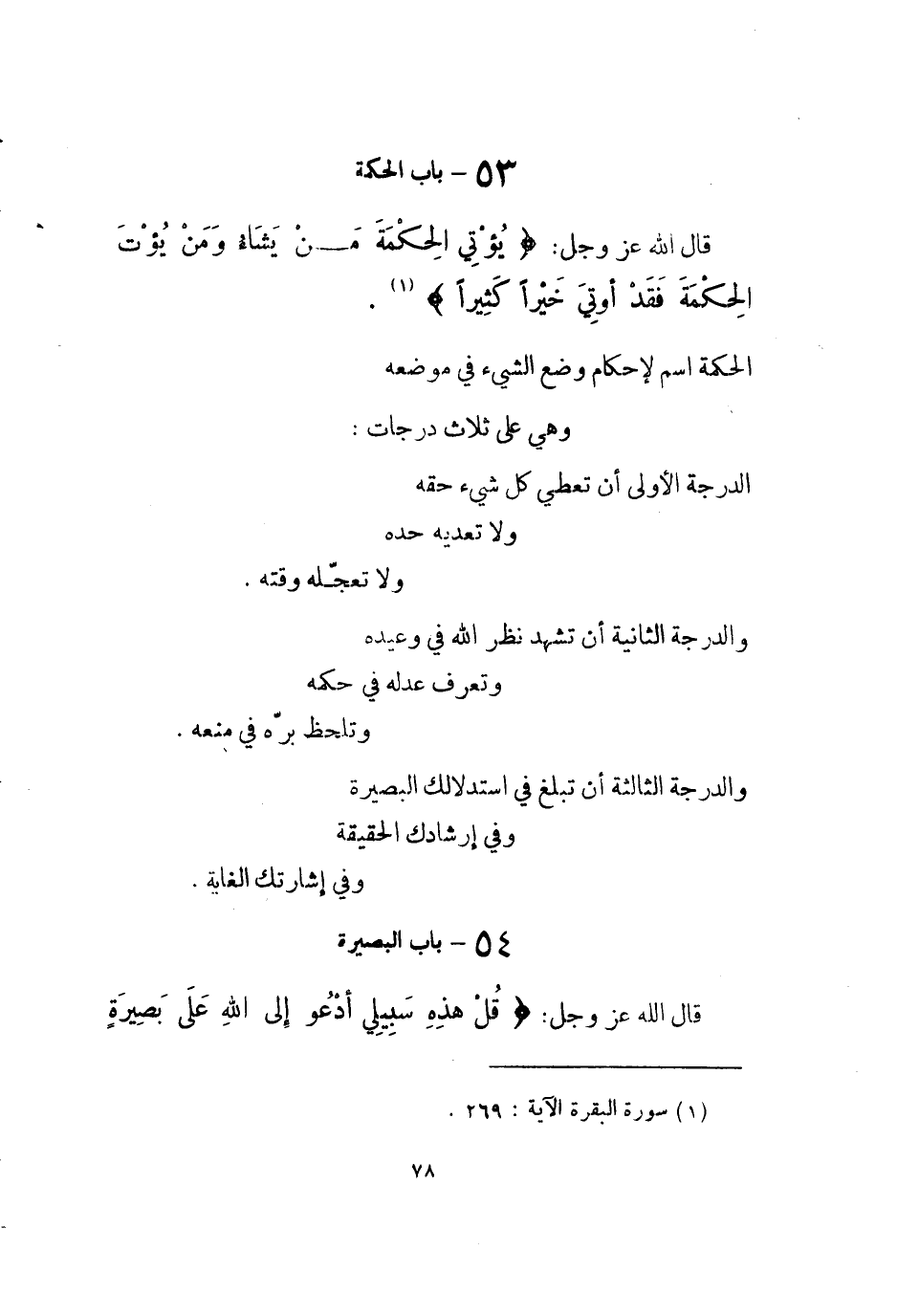 والدرجة الثَّالِثَة أَن تبلغ فِي استدلالك البصيرة وَفِي إرشادك الْحَقِيقَة وَفِي إشارتك الْغَايَة 54 بَاب البصيرة