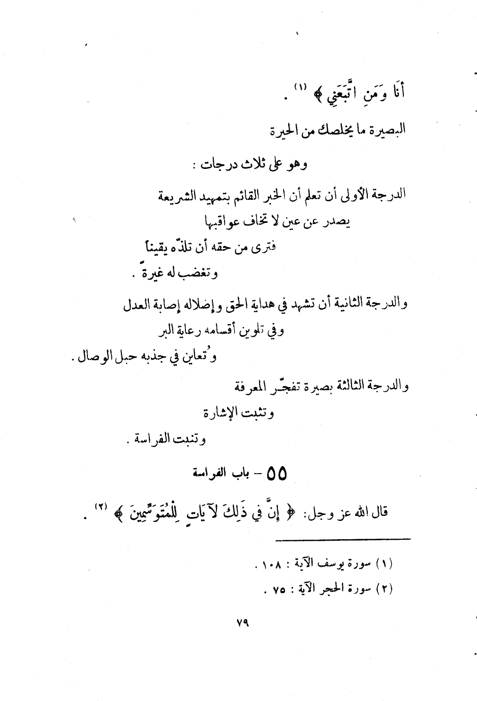 والدرجة الثَّالِثَة بَصِيرَة تفجر الْمعرفَة وَتثبت الْإِشَارَة وتنبت الفراسة