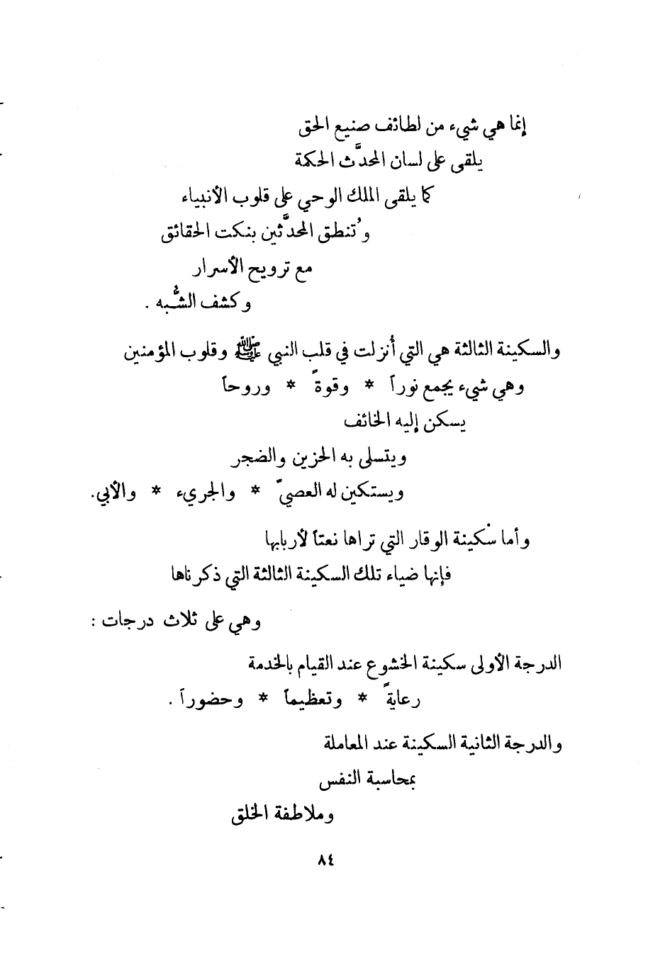 والسكينة الثَّالِثَة هِيَ الَّتِي أنزلت فِي قلب النَّبِي صلى الله عَلَيْهِ وَسلم صلى الله عَلَيْهِ وَسلم وَقُلُوب الْمُؤمنِينَ وَهِي شَيْء يجمع نورا وَقُوَّة وروحا يسكن إِلَيْهِ الْخَائِف ويتسلى بِهِ الحزين والضجر ويستكين لَهُ العصي والجري والأبي