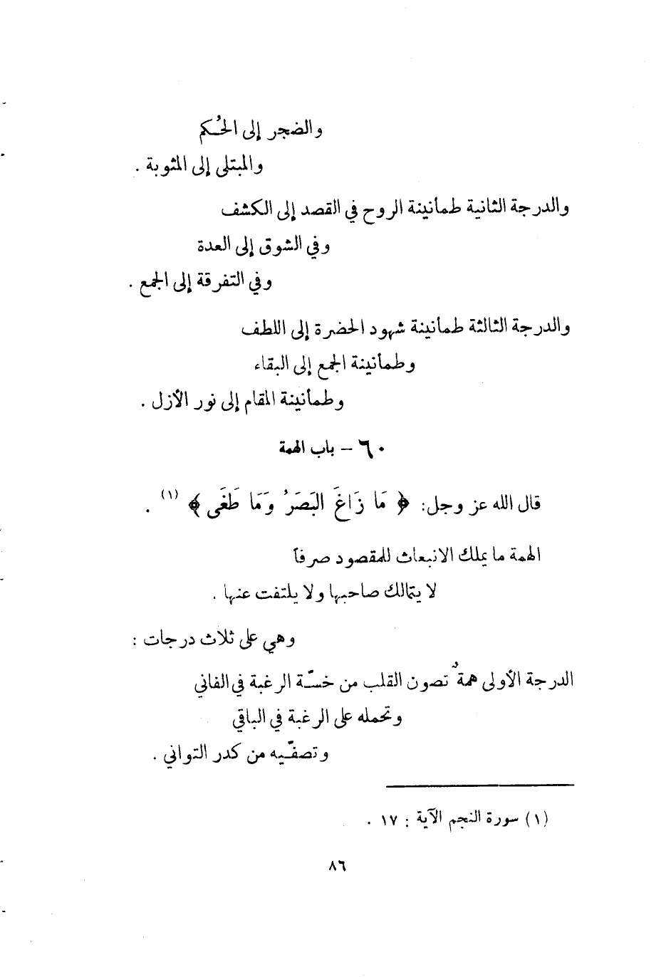 والدرجة الثَّانِيَة طمأنينة الرّوح فِي الْقَصْد إِلَى الْكَشْف وَفِي الشوق إِلَى الْعدة وَفِي التَّفْرِقَة إِلَى الْجمع