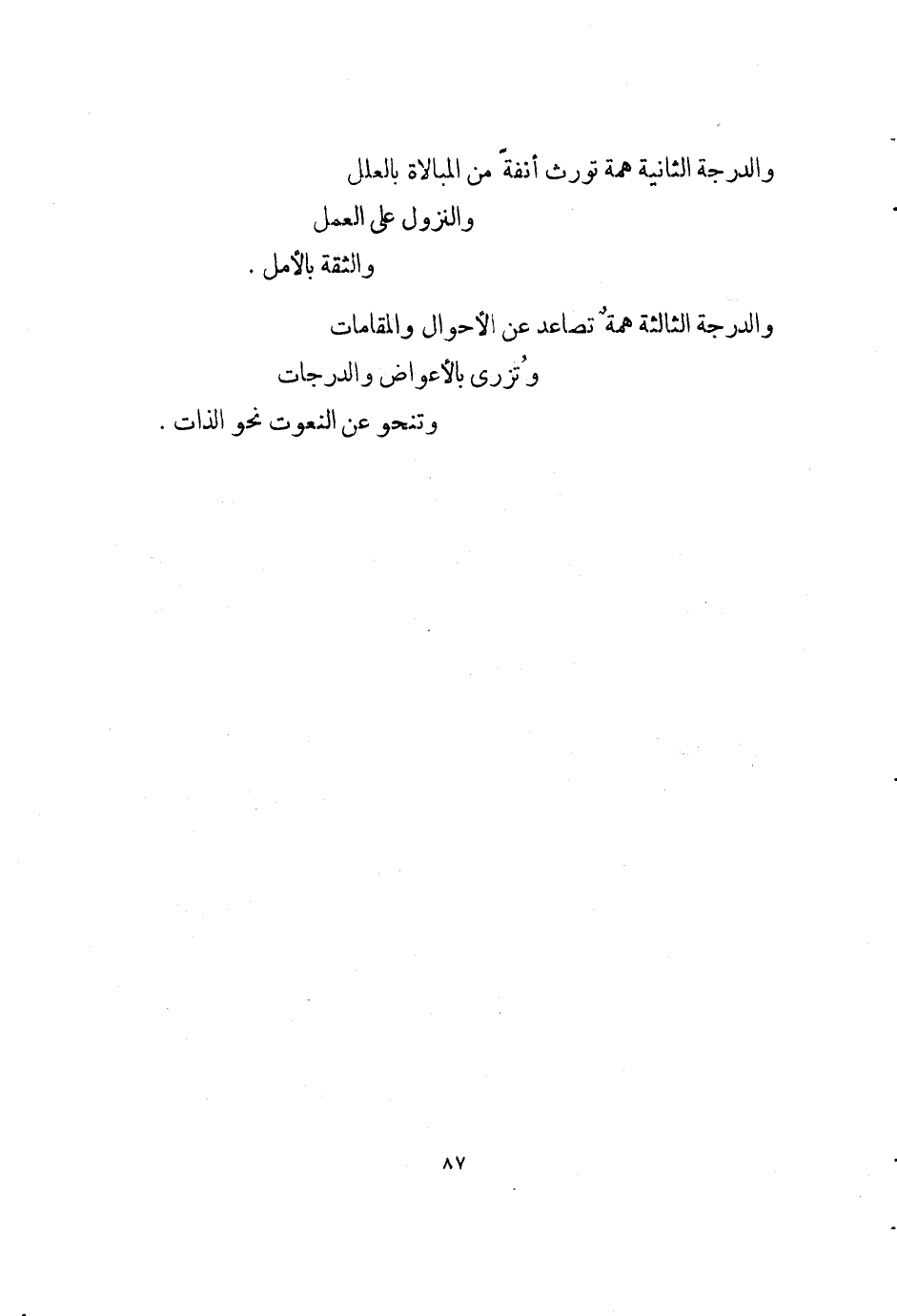 والدرجة الثَّالِثَة همة تصاعد عَن الْأَحْوَال والمقامات وتزرى بالأعواض والدرجات وتنحو عَن النعوت نَحْو الذَّات