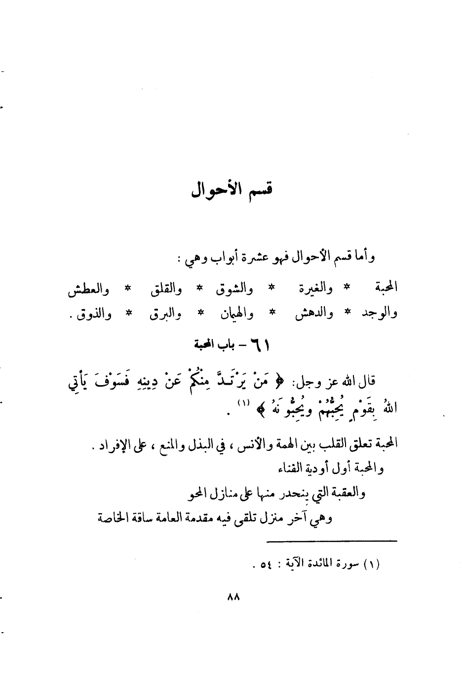 والمحبة أول أَوديَة الفناء والعقبة الَّتِي ينحدر مِنْهَا على منَازِل المحو وَهِي آخر منزل تلقى فِيهِ مُقَدّمَة الْعَامَّة ساقة الْخَاصَّة