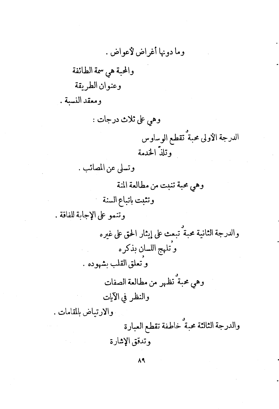 الدرجَة الأولى محبَّة تقطع الوساوس وتلذ الْخدمَة وتسلي عَن المصائب