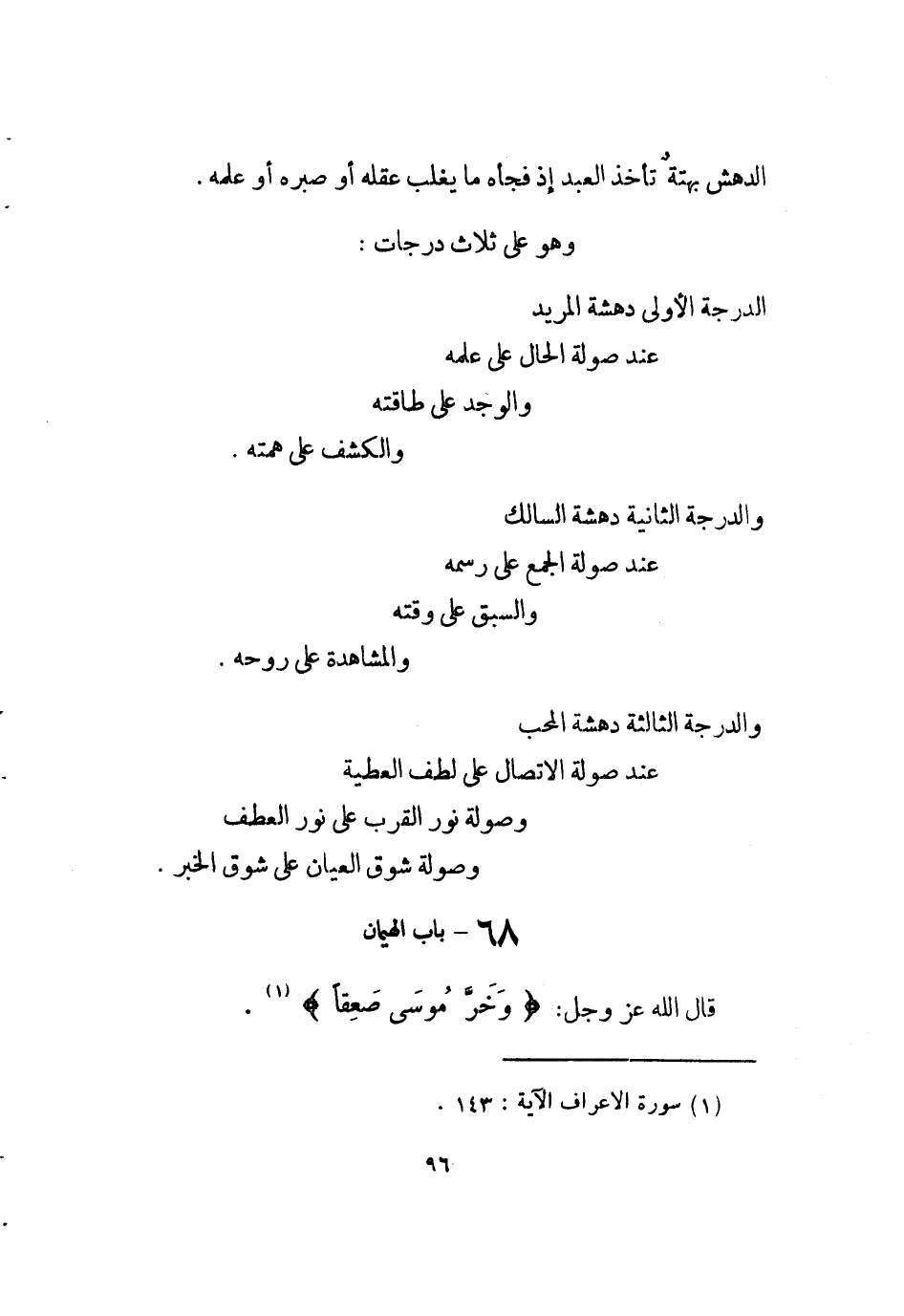 والدرجة الثَّالِثَة دهشة الْمُحب عِنْد وصولة الِاتِّصَال على لطف الْعَطِيَّة وُصُوله نور الْقرب على نور الْعَطف وصولة شوق العيان على شوق الْخَبَر