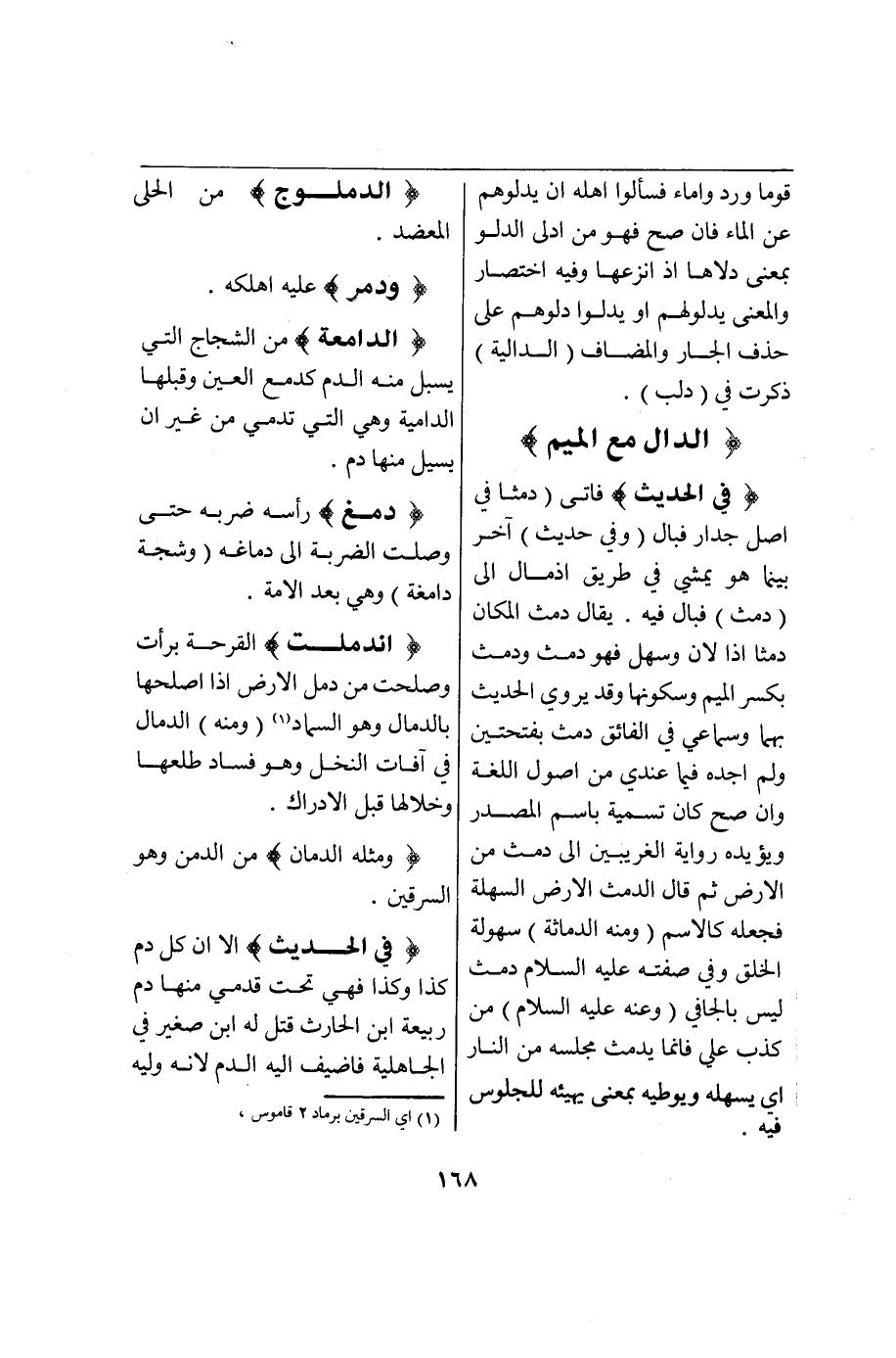 (د م ث) : (فِي الْحَدِيثِ) «فَأَتَى دَمِثًا فِي أَصْلِ جِدَارٍ فَبَالَ» (وَفِي حَدِيثٍ) آخَرَ «بَيْنَمَا هُوَ يَمْشِي فِي طَرِيقٍ إذْ مَالَ إلَى دَمِثٍ فَبَالَ فِيهِ» يُقَالُ (دَمِثَ) الْمَكَانُ دَمَثًا إذَا لَانَ وَسَهُلَ فَهُوَ دَمِثٌ وَدَمِثٌ بِكَسْرِ الْمِيم وَسُكُونِهَا وَقَدْ يُرْوَى الْحَدِيثُ بِهِمَا وَسَمَاعِيٌّ فِي الْفَائِقِ دَمَثٍ بِفَتْحَتَيْنِ وَلَمْ أَجِدْهُ فِيمَا عِنْدِي مِنْ أُصُولِ اللُّغَةِ وَإِنْ صَحَّ كَانَ تَسْمِيَةً بِاسْمِ الْمَصْدَرِ وَيُؤَيِّدُهُ رِوَايَةُ الْغَرِيبَيْنِ إلَى دَمَثٍ مِنْ الْأَرْضِ ثُمَّ قَالَ الدَّمَثُ الْأَرْضُ السَّهْلَةُ فَجَعَلَهُ كَالِاسْمِ (وَمِنْهُ الدَّمَاثَةُ) سُهُولَةُ الْخُلُقِ وَفِي صِفَتِهِ - عَلَيْهِ السَّلَامُ - دَمِثٌ لَيْسَ بِالْجَافِي (وَعَنْهُ - عَلَيْهِ السَّلَامُ -) «مَنْ كَذَبَ عَلَيَّ فَإِنَّمَا يُدَمِّثُ مَجْلِسَهُ مِنْ النَّارِ» أَيْ يُسَهِّلُهُ وَيُوَطِّئُهُ بِمَعْنَى يُهَيِّئُهُ لِلْجُلُوسِ فِيهِ.