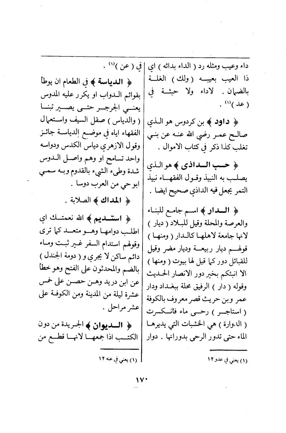 (د ور) : (الدَّارُ) اسْمٌ جَامِعٌ لِلْبِنَاءِ وَالْعَرْصَةِ وَالْمَحَلَّةِ وَقِيلَ لِلْبِلَادِ (دِيَارٌ) لِأَنَّهَا جَامِعَةٌ لِأَهْلِهَا كَالدَّارِ (وَمِنْهَا) قَوْلُهُمْ دِيَارُ رَبِيعَةَ وَدِيَارُ مُضَرَ وَقِيلَ لِلْقَبَائِلِ دُورٌ كَمَا قِيلَ لَهَا بُيُوتٌ (وَمِنْهَا) «أَلَا أُنَبِّئُكُمْ بِخَيْرِ دُورِ الْأَنْصَارِ» الْحَدِيث وَقَوْلُهُ (دَارُ) الرَّقِيقِ مَحَلَّةٌ بِبَغْدَادَ وَدَارُ عَمْرِو بْنِ حُرَيْثٍ قَصْرٌ مَعْرُوفٌ بِالْكُوفَةِ (اسْتَأْجَرَ) رَحَى مَاءٍ فَانْكَسَرَتْ (الدَّوَّارَةُ) هِيَ الْخَشَبَاتُ الَّتِي يُدِيرُهَا الْمَاءُ حَتَّى تَدُورَ الرَّحَى بِدَوَرَانِهَا دَوَّارٌ فِي (ع ن) .