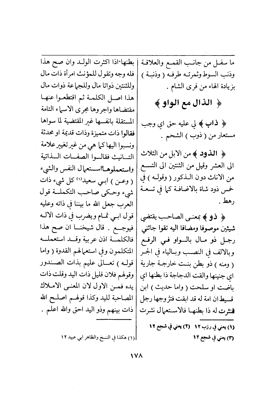 (ذ و) : (ذُو) بِمَعْنَى الصَّاحِبِ يَقْتَضِي شَيْئَيْنِ مَوْصُوفًا وَمُضَافًا إلَيْهِ تَقُولُ جَاءَنِي رَجُلٌ ذُو مَالٍ بِالْوَاوِ فِي الرَّفْعِ وَبِالْأَلِفِ فِي النَّصْبِ وَبِالْيَاءِ فِي الْجَرِّ (وَمِنْهُ) ذُو بَطْنٍ بِنْتِ خَارِجَةَ جَارِيَةٌ أَيْ جَنِينُهَا وَأَلْقَتْ الدَّجَاجَةُ ذَا بَطْنِهَا أَيْ بَاضَتْ أَوْ سَلَحَتْ (وَأَمَّا حَدِيثُ) ابْنِ قُسَيْطٍ أَنَّ أَمَةً لَهُ قَدْ أَبَقَتْ فَتَزَوَّجَهَا رَجُلٌ فَنَثَرَتْ لَهُ ذَا بَطْنِهَا فَالِاسْتِعْمَالُ نَثَرَتْ بَطْنَهَا إذَا أَكْثَرَتْ الْوَلَدَ وَإِنْ صَحَّ هَذَا فَلَهُ وَجْهٌ وَتَقُولُ لِلْمُؤَنَّثِ امْرَأَةٌ ذَاتُ مَالٍ وَلِلثِّنْتَيْنِ ذَوَاتَا مَالٍ وَلِلْجَمَاعَةِ ذَوَاتُ مَالٍ هَذَا أَصْلُ الْكَلِمَةِ ثُمَّ اقْتَطَعُوا عَنْهَا مُقْتَضَيَيْهَا وَأَجْرَوْهَا مُجْرَى الْأَسْمَاءِ التَّامَّةِ الْمُسْتَقِلَّةِ بِأَنْفُسِهَا غَيْرِ الْمُقْتَضِيَةِ لِمَا سِوَاهَا فَقَالُوا ذَاتٌ مُتَمَيِّزَةٌ وَذَوَاتٌ قَدِيمَةٌ أَوْ مُحْدَثَةٌ وَنَسَبُوا إلَيْهَا كَمَا هِيَ مِنْ غَيْرِ تَغْيِيرِ عَلَامَةِ التَّأْنِيثِ فَقَالُوا الصِّفَاتُ الذَّاتِيَّةُ وَاسْتَعْمَلُوهَا اسْتِعْمَالَ النَّفْسِ وَالشَّيْءِ (وَعَنْ) أَبِي سَعِيدٍ كُلُّ شَيْءٍ ذَاتٌ وَكُلُّ ذَاتٍ شَيْءٌ وَحَكَى صَاحِبُ التَّكْمِلَةِ قَوْلَ الْعَرَبِ جَعَلَ اللَّهُ مَا بَيْنَنَا فِي ذَاته وَعَلَيْهِ قَوْلُ أَبِي تَمَّامٍ