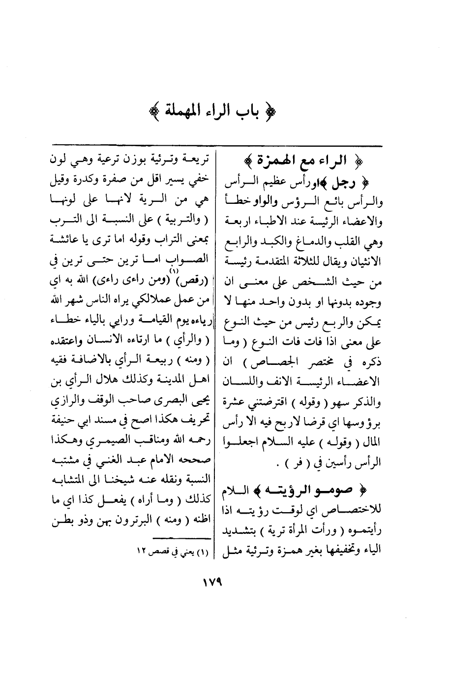 (ر أي) : «صُومُوا لِرُؤْيَتِهِ» اللَّامُ لِلِاخْتِصَاصِ أَيْ لِوَقْتِ رُؤْيَتِهِ إذَا رَأَيْتُمُوهُ (وَرَأَتْ الْمَرْأَةُ تَرِيَّةً) بِتَشْدِيدِ الْيَاءِ وَتَخْفِيفهَا بِغَيْرِ هَمْزَة وَتَرْئِيَةٌ مِثْلُ تَرْعِيَةٍ وَتَرْئِيَةٌ بِوَزْنِ تَرْعِيَةٍ وَهِيَ لَوْنٌ خَفِيٌّ يَسِيرٌ أَقُلُّ مِنْ صُفْرَةٍ وَكُدْرَةٍ وَقِيلَ هِيَ مِنْ الرُّؤْيَةِ لِأَنَّهَا عَلَى لَوْنِهَا (وَالتُّرْبِيَّةُ) عَلَى النِّسْبَةِ إلَى التُّرْبِ بِمَعْنَى التُّرَابِ وَقَوْلُهُ «أَمَا تَرَيْ يَا عَائِشَةُ» الصَّوَابُ أَمَا تَرَيْنَ وحَتَّى تَرَيْنَ فِي (ق ص) «وَمَنْ رَاءَى رَاءَى اللَّهُ بِهِ» أَيْ مَنْ عَمِلَ عَمَلًا لِكَيْ يَرَاهُ النَّاسُ شَهَّرَ اللَّهُ رِيَاءَهُ يَوْمَ الْقِيَامَةِ وَرَايَا بِالْيَاءِ خَطَأٌ (وَالرَّأْيُ) مَا ارْتَآهُ الْإِنْسَانُ وَاعْتَقَدَهُ (وَمِنْهُ) رَبِيعَةُ الرَّأْيِ بِالْإِضَافَةِ فَقِيهُ أَهْلِ الْمَدِينَةِ وَكَذَلِكَ هِلَالُ الرَّأْيِ بْنُ يَحْيَى الْبَصْرِيُّ صَاحِبُ الْوَقْفِ وَالرَّازِيُّ تَحْرِيفٌ
