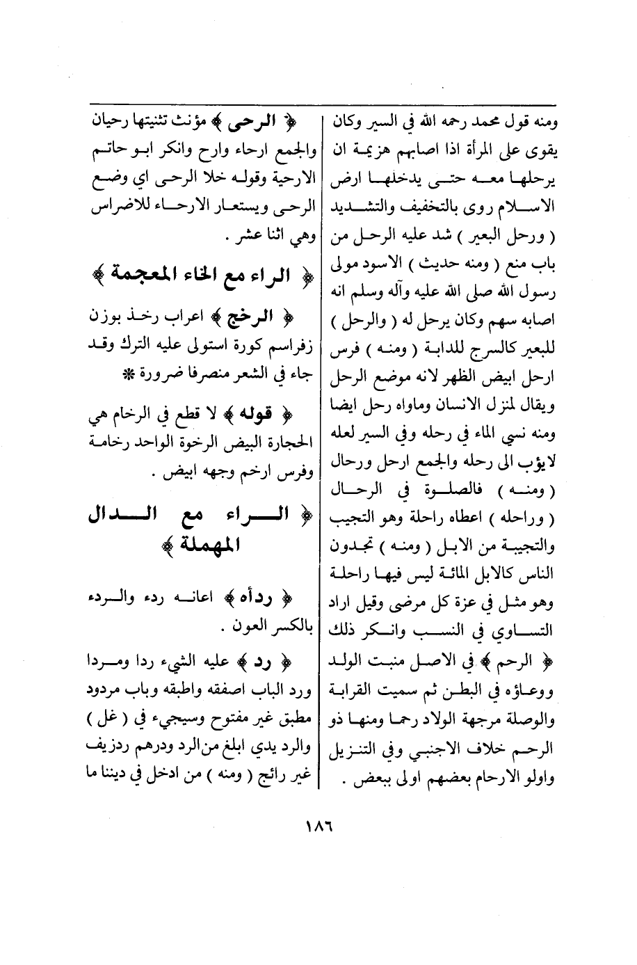 (ر ح ل) : (رَحَلَ) عَنْ الْبَلَدِ شَخَصَ وَسَارَ وَرَحَّلْتُهُ أَنَا وَأَرْحَلْتُهُ أَشْخَصْتُهُ وَمِنْهُ قَوْلُ مُحَمَّدٍ - رَحِمَهُ اللَّهُ - فِي السِّيَرِ وَكَانَ يَقْوَى عَلَى الْمَرْأَةِ إذَا أَصَابَهُمْ هَزِيمَةٌ أَنْ يُرَحِّلَهَا مَعَهُ حَتَّى يُدْخِلَهَا أَرْضَ الْإِسْلَامِ رُوِيَ بِالتَّخْفِيفِ وَالتَّشْدِيدِ (وَرَحَلَ الْبَعِيرَ) شَدَّ عَلَيْهِ الرَّحْلَ مِنْ بَابِ مَنَعَ (وَمِنْهُ حَدِيثُ) الْأَسْوَدِ مَوْلَى رَسُولِ اللَّهِ - صَلَّى اللَّهُ عَلَيْهِ وَآلِهِ وَسَلَّمَ - أَنَّهُ أَصَابَهُ سَهْمٌ وَكَانَ يُرَحِّلُ لَهُ (وَالرَّحْلُ) لِلْبَعِيرِ كَالسَّرْجِ لِلدَّابَّةِ (وَمِنْهُ) فَرَسٌ أَرْحَلُ أَبْيَض الظَّهْرِ لِأَنَّهُ مَوْضِعُ الرَّحْلِ وَيُقَالُ لِمَنْزِلِ الْإِنْسَانِ وَمَأْوَاهُ رَحْلٌ أَيْضًا وَمِنْهُ نَسِيَ الْمَاءَ فِي رَحْلِهِ وَفِي السِّيَرِ لَعَلَّهُ لَا يَئُوبُ إلَى رَحْلِهِ وَالْجَمْعُ أَرْحُلٌ وَرِحَالٌ (وَمِنْهُ) فَالصَّلَاةُ فِي الرِّحَالِ (وَرَاحَلَهُ) أَعْطَاهُ رَاحِلَةً وَهُوَ النَّجِيبُ وَالنَّجِيبَةُ مِنْ الْإِبِلِ (وَمِنْهُ) «تَجِدُونَ النَّاسَ كَالْإِبِلِ الْمِائَةِ لَيْسَ فِيهَا رَاحِلَةٌ» وَهُوَ مَثَلٌ فِي عِزَّةِ كُلِّ مَرْضِيٍّ وَقِيلَ أَرَادَ التَّسَاوِيَ فِي النَّسَبِ وَأُنْكِرَ ذَلِكَ.