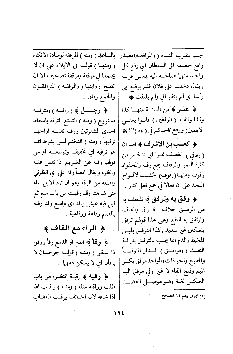 (ر ف ق) : (رَفَقَ بِهِ وَتَرَفَّقَ) تَلَطَّفَ بِهِ مِنْ الرِّفْقِ خِلَافُ الْخُرْقِ وَالْعُنْفِ وَارْتَفَقَ بِهِ انْتَفَعَ وَعَلَى هَذَا قَوْلُهُمْ تَرَفَّقَ بِنُسُكَيْنِ غَيْرُ سَدِيدٍ وَكَذَا التَّرَفُّقُ بِلُبْسِ الْمَخِيطِ وَالدَّمِ إنَّمَا يَجِبُ بِالتَّرَفُّقِ بِإِزَالَةِ التَّفَثِ (وَمَرَافِقُ) الدَّارِ الْمُتَوَضَّأُ وَالْمَطْبَخُ وَنَحْوُ ذَلِكَ وَالْوَاحِدُ مِرْفَقٌ بِكَسْرِ الْمِيمِ وَفَتْحِ الْفَاءِ لَا غَيْرُ وَفِي مِرْفَقِ الْيَدِ الْعَكْسُ لُغَةً وَهُوَ مَوْصِلُ الْعَضُدِ بِالسَّاعِدِ (وَمِنْهُ) الْمِرْفَقَةُ لِوِسَادَةِ الِاتِّكَاءِ (وَمِنْهَا) قَوْلُهُ فِي الْإِيلَاءِ عَلَى أَنْ لَا يَجْتَمِعَا فِي مِرْفَقَةٍ وَمَرْفَقَةٌ تَصْحِيفٌ إلَّا أَنْ تَصِحّ رِوَايَتُهَا (وَالرُّفْقَةُ) الْمُتَرَافِقُونَ وَالْجَمْعُ رِفَاقٌ.