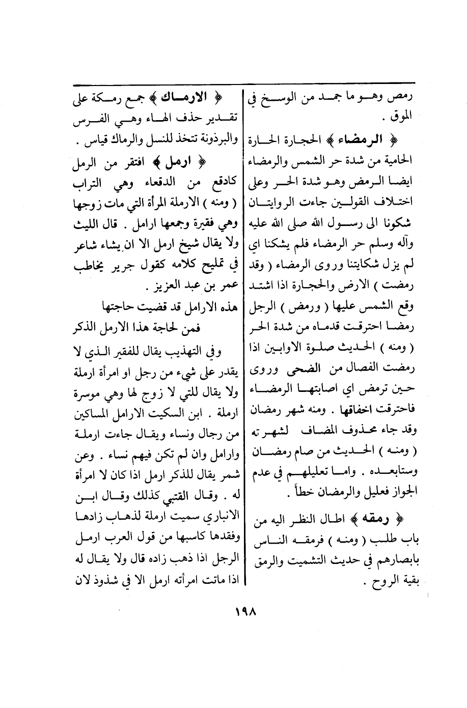 (ر م ض) : (الرَّمْضَاءُ) الْحِجَارَةُ الْحَارَّةُ الْحَامِيَةُ مِنْ شِدَّةِ حَرِّ الشَّمْسِ وَالرَّمْضَاءُ أَيْضًا الرَّمَضُ وَهُوَ شِدَّةُ الْحَرِّ وَعَلَى اخْتِلَاف الْقَوْلَيْنِ جَاءَتْ الرِّوَايَتَانِ «شَكَوْنَا إلَى رَسُولِ اللَّهِ صَلَّى اللَّهُ عَلَيْهِ وَآلِهِ وَسَلَّمَ حَرَّ الرَّمْضَاءِ فَلَمْ يُشْكِنَا» أَيْ لَمْ يُزِلْ شِكَايَتَنَا وَرُوِيَ الرَّمْضَاءَ (وَقَدْ رَمِضَتْ) الْأَرْضُ وَالْحِجَارَةُ إذَا اشْتَدَّ وَقْعُ الشَّمْسِ عَلَيْهَا (وَرَمِضَ) الرَّجُلُ رَمَضًا احْتَرَقَتْ قَدَمَاهُ مِنْ شِدَّةِ الْحَرِّ (وَمِنْهُ) الْحَدِيثُ «صَلَاةُ الْأَوَّابِينَ إذَا رَمِضَتْ الْفِصَالُ مِنْ الضُّحَى» وَرُوِيَ حِينَ تَرْمَضُ أَيْ أَصَابَتْهَا الرَّمْضَاءُ فَاحْتَرَقَتْ أَخْفَافُهَا وَمِنْهُ شَهْرُ رَمَضَانَ وَقَدْ جَاءَ مَحْذُوفَ الْمُضَافِ لِشُهْرَتِهِ (وَمِنْهُ) الْحَدِيثُ «مَنْ صَامَ رَمَضَانَ وَسِتًّا بَعْدَهُ» وَأَمَّا تَعْلِيلُهُمْ فِي عَدَمِ الْجَوَازِ فَعَلِيلٌ وَالرَّمَضَانُ خَطَأٌ.