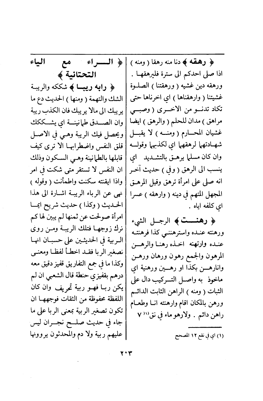 (ر هـ ن) : (رَهَنْتُ) الرَّجُلَ الشَّيْءَ وَرَهَنْتُهُ عِنْدَهُ وَاسْتَرْهَنَنِي كَذَا فَرَهَنْتُهُ عِنْدَهُ وَارْتَهَنَهُ أَخَذَهُ رَهْنًا وَالرَّهْنُ الْمَرْهُونُ وَالْجَمْعُ رُهُونٌ وَرِهَانٌ وَرُهُنٌ وَأَنَا رَهْنٌ بِكَذَا أَوْ رَهِينٌ وَرَهِينَةٌ أَيْ مَأْخُوذٌ بِهِ وَأَصْلُ التَّرْكِيبِ دَالٌّ عَلَى الثَّبَاتِ (وَمِنْهُ) الرَّاهِنُ الثَّابِتُ الدَّائِمُ وَرَهَنَ بِالْمَكَانِ أَقَامَ وَأَرْهَنْتُهُ أَنَا وَطَعَامٌ رَاهِنٌ دَائِمٌ وَلَا رَهْوُ مَاءٍ فِي ن ق.