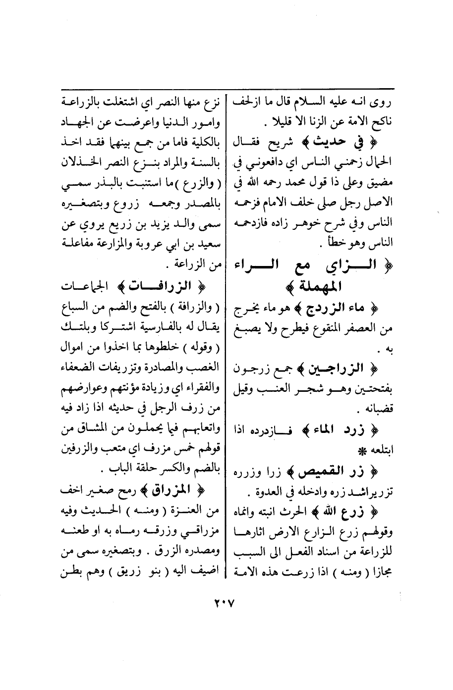 (ز ر ع) : (زَرَعَ اللَّهُ) الْحَرْثَ أَنْبَتَهُ وَأَنْمَاهُ وَقَوْلُهُمْ زَرَعَ الزَّارِعُ الْأَرْضَ أَثَارَهَا لِلزِّرَاعَةِ مِنْ إسْنَادِ الْفِعْلِ إلَى السَّبَبِ مَجَازًا (وَمِنْهُ) إذَا زَرَعَتْ هَذِهِ الْأُمَّةُ نُزِعَ مِنْهَا النَّصْرُ أَيْ اشْتَغَلَتْ بِالزِّرَاعَةِ وَأُمُورِ الدُّنْيَا وَأَعْرَضَتْ عَنْ الْجِهَادِ بِالْكُلِّيَّةِ فَأَمَّا مَنْ جَمَعَ بَيْنَهُمَا فَقَدْ أَخَذَ بِالسُّنَّةِ وَالْمُرَادُ بِنَزْعِ النَّصْرِ الْخِذْلَانُ (وَالزَّرْعُ) مَا اسْتُنِبْتَ بِالْبَذْرِ سُمِّيَ بِالْمَصْدَرِ وَجَمْعُهُ زُرُوعٌ وَبِتَصْغِيرِهِ سُمِّيَ وَالِدُ يَزِيدَ بْنِ زُرَيْعٍ يَرْوِي عَنْ سَعِيدِ بْنِ أَبِي عَرُوبَةَ وَالْمُزَارَعَةُ مُفَاعَلَةٌ مِنْ الزِّرَاعَةِ.