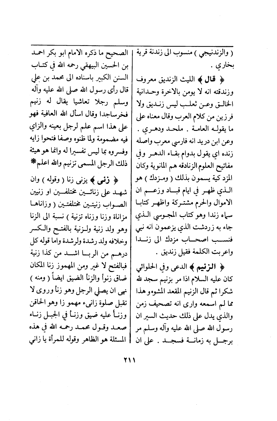 (ز ن د ق) : (قَالَ) اللَّيْثُ الزِّنْدِيقُ مَعْرُوفٌ وَزَنْدَقَتُهُ أَنَّهُ لَا يُؤْمِنُ بِالْآخِرَةِ وَوَحْدَانِيَّةِ الْخَالِقِ وَعَنْ ثَعْلَبٍ لَيْسَ زِنْدِيقُ وَلَا فَرَزِينُ مِنْ كَلَامِ الْعَرَبِ وَقَالَ مَعْنَاهُ عَلَى مَا يَقُولُهُ الْعَامَّةُ مُلْحِدٌ وَدَهْرِيٌّ وَعَنْ ابْنِ دُرَيْدٍ أَنَّهُ فَارِسِيٌّ مُعَرَّبٌ وَأَصْلُهُ زَنْدَهْ أَيْ يَقُولُ بِدَوَامِ بَقَاءِ الدَّهْرِ وَفِي مَفَاتِيحِ الْعُلُومِ الزَّنَادِقَةُ هُمْ الْمَانَوِيَّةُ وَكَانَ الْمَزْدَكِيَّةُ يُسَمَّوْنَ بِذَلِكَ (وَمَزْدَكُ) هُوَ الَّذِي ظَهَرَ فِي أَيَّامِ قباذ وَزَعَمَ أَنَّ الْأَمْوَالَ وَالْحُرَمَ مُشْتَرَكَةٌ وَأَظْهَرَ كِتَابًا سَمَّاهُ زِنْدًا وَهُوَ كِتَابُ الْمَجُوسِيِّ الَّذِي جَاءَ بِهِ زَرَادُشْتَ الَّذِي يَزْعُمُونَ أَنَّهُ نَبِيٌّ فَنُسِبَ أَصْحَابُ مَزْدَكَ إلَى زِنْدَا وَعُرِّبَتْ الْكَلِمَةُ فَقِيلَ زِنْدِيقٌ.