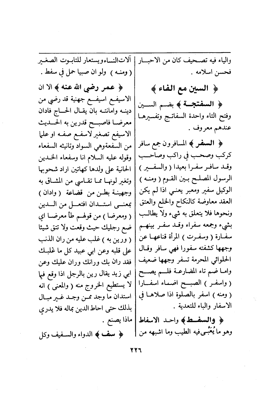 (س ف ر) : (السَّفْرُ) الْمُسَافِرُونَ جَمْعُ سَافِرٍ كَرَكْبِ وَصَحْبٍ فِي رَاكِبٍ وَصَاحِبٍ وَقَدْ سَافَرَ سَفَرًا بَعِيدًا (وَالسَّفِيرُ) الرَّسُولُ الْمُصْلِحُ بَيْنَ الْقَوْمِ (وَمِنْهُ) الْوَكِيلُ سَفِيرٌ وَمُعَبِّرٌ يَعْنِي إذَا لَمْ يَكُنِ الْعَقْدُ مُعَاوَضَةً كَالنِّكَاحِ وَالْخُلْعِ وَالْعِتْقِ وَنَحْوِهَا فَلَا يَتَعَلَّقُ بِهِ شَيْءٌ وَلَا يُطَالَبُ بِشَيْءٍ وَجَمْعُهُ سُفَرَاءُ وَقَدْ سَفَرَ بَيْنَهُمْ سِفَارَةً (وَسَفَرَتْ) الْمَرْأَةُ قِنَاعَهَا عَنْ وَجْهِهَا كَشَفَتْهُ سُفُورًا فَهِيَ سَافِرٌ وَقَوْلُ الْحَلْوَائِيِّ الْمُحْرِمَةُ تَسْفِرُ وَجْهَهَا ضَعِيفٌ وَأَمَّا ضَمُّ تَاءِ الْمُضَارَعَةِ فَلَمْ يَصِحَّ (وَأَسْفَرَ) الصُّبْحُ أَضَاءَ إسْفَارًا (وَمِنْهُ) أَسْفَرَ بِالصَّلَاةِ إذَا صَلَّاهَا فِي الْإِسْفَارِ وَالْبَاءُ لِلتَّعْدِيَةِ.
