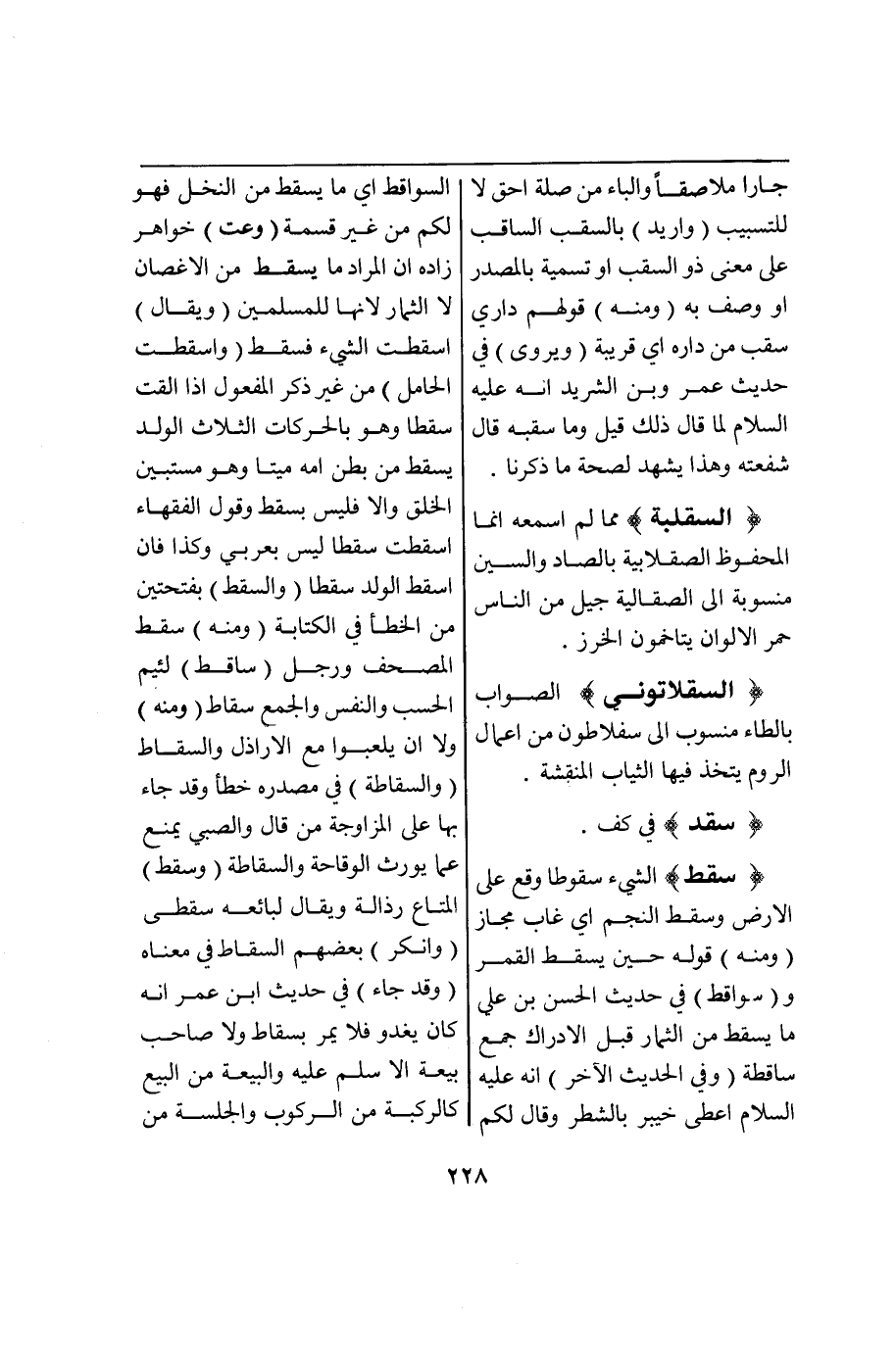 (س ق ط) : (سَقَطَ) الشَّيْءُ سُقُوطًا وَقَعَ عَلَى الْأَرْضِ وَسَقَطَ النَّجْمُ أَيْ غَابَ مَجَازًا (وَمِنْهُ) قَوْلُهُ حِينَ يَسْقُطُ الْقَمَرُ (وَسَوَاقِطُ) فِي حَدِيثِ الْحَسَنِ بْنِ عَلِيٍّ «مَا يَسْقُطُ مِنْ الثِّمَارِ قَبْلَ الْإِدْرَاكِ» جَمْعُ سَاقِطَةٍ (وَفِي الْحَدِيثِ الْآخَرِ) «أَنَّهُ - عَلَيْهِ السَّلَامُ - أَعْطَى خَيْبَرَ بِالشَّطْرِ وَقَالَ لَكُمْ السَّوَاقِطُ» أَيْ مَا يَسْقُطُ مِنْ النَّخْلِ فَهُوَ لَكُمْ مِنْ غَيْرِ قِسْمَةٍ (وَعَنْ) خُوَاهَرْ زَادَهْ أَنَّ الْمُرَادَ مَا يَسْقُطُ مِنْ الْأَغْصَانِ لَا الثِّمَارِ لِأَنَّهَا لِلْمُسْلِمِينَ (وَيُقَالُ) أَسْقَطْتُ الشَّيْءَ فَسَقَطَ (وَأَسْقَطَتْ الْحَامِلُ) مِنْ غَيْرِ ذِكْرِ الْمَفْعُولِ إذَا أَلْقَتْ سِقْطًا وَهُوَ بِالْحَرَكَاتِ الثَّلَاثِ الْوَلَدُ يَسْقُطُ مِنْ بَطْنِ أُمِّهِ مَيِّتًا وَهُوَ مُسْتَبِينُ الْخَلْقِ وَإِلَّا فَلَيْسَ بِسِقْطٍ وَقَوْلُ الْفُقَهَاءِ أَسْقَطَتْ سِقْطًا لَيْسَ بِعَرَبِيٍّ وَكَذَا فَإِنْ أُسْقِطَ الْوَلَدُ سِقْطًا (وَالسَّقَطُ) بِفَتْحَتَيْنِ مِنْ الْخَطَأِ فِي الْكِتَابَةِ (وَمِنْهُ) سَقَطُ الْمُصْحَفُ وَرَجُلٌ (سَاقِطٌ) لَئِيمُ الْحَسَبِ وَالنَّفْسِ وَالْجَمْعُ سُقَّاطٌ (وَمِنْهُ) وَلَا أَنْ يَلْعَبُوا مَعَ الْأَرَاذِلِ وَالسُّقَّاطِ (وَالسُّقَاطَةُ) فِي مَصْدَرِهِ خَطَأٌ وَقَدْ جَاءَ بِهَا عَلَى الْمُزَاوَجَةِ