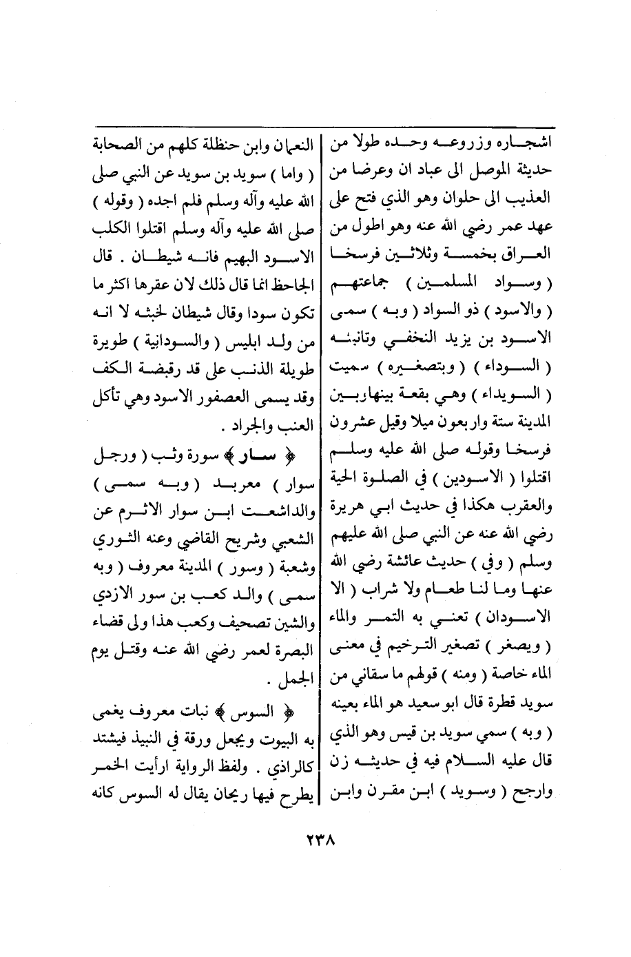 (س ود) : (السَّيِّدُ) ذُو السُّؤْدُدِ (وَمِنْهُ) السَّيِّدُ مِنْ الْمُعِزِّ وَهُوَ الْمُسِنُّ أَوْ الثَّنِيُّ (وَالسَّوَادُ) خِلَافُ الْبَيَاضِ (وَفِي الْحَدِيثِ) «يَمْشِيَانِ فِي سَوَادٍ وَيَأْكُلَانِ فِي سَوَادٍ» يُرِيدُ سَوَادَ قَوَائِمِهَا وَأَفْوَاهِهِمَا (وَاسْوِدَادُ الْوَجْهِ) فِي قَوْله تَعَالَى {ظَلَّ وَجْهُهُ مُسْوَدًّا} [النحل: 58] عِبَارَةٌ عَنْ الْحُزْنِ أَوْ الْكَرَاهَةِ وَسُمِّيَ (سَوَادُ الْعِرَاقِ) لِخُضْرَةِ أَشْجَارِهِ وَزُرُوعِهِ وَحَدُّهُ طُولًا مِنْ حَدِيثَةِ الْمَوْصِلِ إلَى عَبَّادَانَ وَعَرْضًا مِنْ الْعُذَيْبِ إلَى حُلْوَانَ وَهُوَ الَّذِي فُتِحَ عَلَى عَهْدِ عُمَرَ - رَضِيَ اللَّهُ عَنْهُ - وَهُوَ أَطْوَلُ مِنْ الْعِرَاقِ بِخَمْسَةٍ وَثَلَاثِينَ فَرْسَخًا (وَسَوَادُ الْمُسْلِمِينَ) جَمَاعَتُهُمْ (وَالْأَسْوَدُ) ذُو السَّوَادِ (وَبِهِ) سُمِّيَ الْأَسْوَدُ بْنُ يَزِيدَ النَّخَعِيُّ وَتَأْنِيثُهُ (السَّوْدَاءُ) (وَبِتَصْغِيرِهَا) سُمِّيَتْ (السُّوَيْدَاءُ) وَهِيَ بُقْعَةٌ بَيْنَهَا وَبَيْنَ الْمَدِينَةِ سِتَّةٌ وَأَرْبَعُونَ مِيلًا وَقِيلَ عِشْرُونَ فَرْسَخًا وَقَوْلُهُ - صَلَّى اللَّهُ عَلَيْهِ وَسَلَّمَ - «اُقْتُلُوا الْأَسْوَدَيْنِ فِي الصَّلَاةِ الْحَيَّةَ وَالْعَقْرَبَ» هَكَذَا فِي حَدِيثِ أَبِي هُرَيْرَةَ - رَضِيَ اللَّهُ عَنْهُ - عَنْ النَّبِيِّ - صَلَّى اللَّهُ عَلَيْهِ وَسَلَّمَ - (وَفِي) حَدِيثِ عَائِشَةَ - رَضِيَ اللَّهُ عَنْهَا - «وَمَا لَنَا طَعَامٌ وَلَا شَرَابٌ إلَّا الْأَسْوَدَيْنِ» تَعْنِي بِهِ التَّمْرَ وَالْمَاءَ (وَيُصَغَّرُ) تَصْغِيرَ التَّرْخِيمِ فِي مَعْنَى الْمَاءِ خَاصَّةً (وَمِنْهُ) قَوْلُهُمْ مَا سَقَانِي مِنْ سُوَيْدٍ قَطْرَةً قَالَ أَبُو سَعِيدٍ هُوَ الْمَاءُ بِعَيْنِهِ (وَبِهِ) سُمِّيَ سُوَيْدُ بْنُ قَيْسٍ وَهُوَ الَّذِي قَالَ - عَلَيْهِ السَّلَامُ - فِي حَدِيثِهِ «زِنْ وَأَرْجِحْ» (وَسُوَيْد) بْنُ مُقَرِّنٍ وَابْنُ النُّعْمَانِ وَابْنُ حَنْظَلَةَ كُلُّهُمْ مِنْ الصَّحَابَةِ (وَأَمَّا) سُوَيْدُ بْنُ سُوَيْدٍ عَنْ النَّبِيِّ - صَلَّى اللَّهُ عَلَيْهِ وَآلِهِ وَسَلَّمَ - فَلَمْ أَجِدْهُ (وَقَوْلُهُ) - صَلَّى اللَّهُ عَلَيْهِ وَآلِهِ وَسَلَّمَ - «اُقْتُلُوا الْكَلْبَ الْأَسْوَدَ الْبَهِيمَ فَإِنَّهُ شَيْطَانٌ» قَالَ الْجَاحِظُ إنَّمَا قَالَ ذَلِكَ لِأَنَّ عُقُرَهَا أَكْثَرُ مَا تَكُونُ سُودًا وَقَالَ شَيْطَانٌ لِخُبْثِهِ لَا أَنَّهُ مِنْ وَلَدِ إبْلِيسَ (وَالسُّودَانِيَّةُ) طُوَيْرَةٌ طَوِيلَةُ الذَّنَبِ عَلَى قَدْرِ قَبْضَةِ الْكَفِّ وَقَدْ تُسَمَّى الْعُصْفُورَ الْأَسْوَدَ وَهِيَ تَأْكُلُ الْعِنَبَ وَالْجَرَادَ.