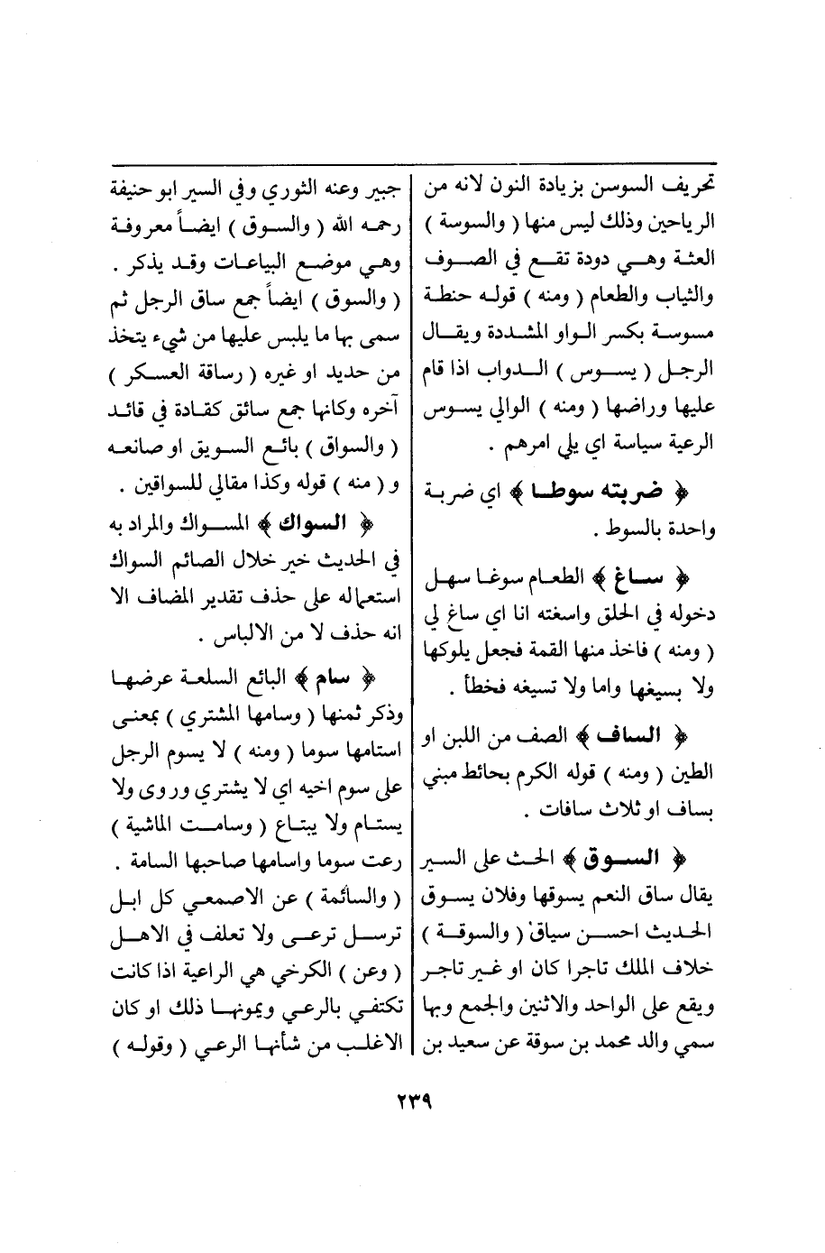(س وق) : (السَّوْقُ) الْحَثُّ عَلَى السَّيْرِ يُقَالُ سَاقَ النَّعَمَ يَسُوقُهَا وَفُلَانٌ يَسُوقُ الْحَدِيثَ أَحْسَنَ سِيَاقٍ (وَالسُّوقَةُ) خِلَافُ الْمَلِكِ تَاجِرًا كَانَ أَوْ غَيْرَ تَاجِرٍ وَيَقَعُ عَلَى الْوَاحِدِ وَالِاثْنَيْنِ وَالْجَمْعِ وَبِهَا سُمِّيَ وَالِدُ مُحَمَّدِ بْنِ سُوقَةَ عَنْ سَعِيدِ بْنِ جُبَيْرٍ وَعَنْهُ الثَّوْرِيُّ وَفِي السِّيَرِ أَبُو حَنِيفَةَ - رَحِمَهُ اللَّهُ - (وَالسُّوقُ) مَعْرُوفَةٌ وَهِيَ مَوْضِعُ الْبِيَاعَاتِ وَقَدْ يُذَكَّرُ (وَالسُّوقُ) أَيْضًا جَمْعُ سَاقِ الرِّجْلِ ثُمَّ سُمِّيَ بِهَا مَا يُلْبَسُ عَلَيْهَا مِنْ شَيْءٍ يُتَّخَذُ مِنْ حَدِيدٍ أَوْ غَيْرِهِ (وَسَاقَةُ الْعَسْكَرِ) آخِرُهُ وَكَأَنَّهَا جَمْعُ سَائِقٍ كَقَادَةٍ فِي قَائِدٍ (وَالسَّوَّاقُ) بَائِعُ السَّوِيقِ أَوْ صَانِعُهُ (وَمِنْهُ) قَوْلُهُ وَكَذَا مَقَالِي السَّوَّاقِينَ.