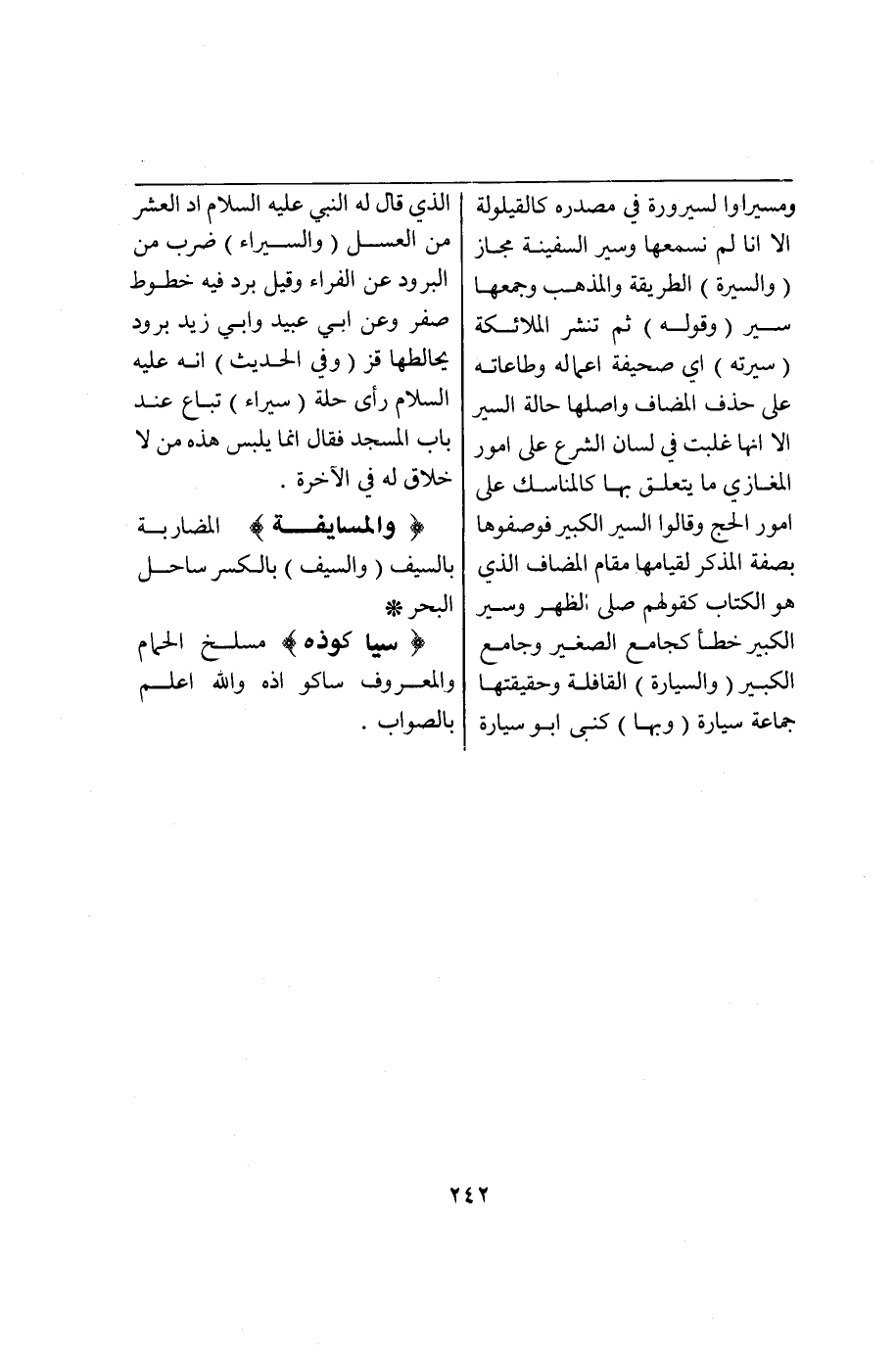 (س ي ر) : (سَارَ) مِنْ بَلَدٍ إلَى بَلَدٍ سَيْرًا وَمَسِيرًا وَالسَّيْرُورَةُ فِي مَصْدَرِهِ كَالْقَيْلُولَةِ إلَّا أَنَّا لَمْ نَسْمَعْهَا وَسَيْرُ السَّفِينَةِ مَجَازٌ (وَالسِّيرَةُ) الطَّرِيقَةُ وَالْمَذْهَبُ وَجَمْعُهَا سِيَرٌ (وَقَوْلُهُ) ثُمَّ تَنْشُرُ الْمَلَائِكَةُ (سِيرَتَهُ) أَيْ صَحِيفَةَ أَعْمَالِهِ وَطَاعَاتِهِ عَلَى حَذْفِ الْمُضَافِ وَأَصْلُهَا حَالَةُ السَّيْرِ إلَّا أَنَّهَا غَلَبَتْ فِي لِسَانِ الشَّرْعِ عَلَى أُمُورِ الْمَغَازِي وَمَا يَتَعَلَّقُ بِهَا كَالْمَنَاسِكِ عَلَى أُمُورِ الْحَجِّ وَقَالُوا السِّيَرُ الْكَبِيرُ فَوَصَفُوهَا بِصِفَةِ الْمُذَكَّرِ لِقِيَامِهَا مَقَامَ الْمُضَافِ الَّذِي هُوَ الْكِتَابُ كَقَوْلِهِمْ صَلَّى الظُّهْرَ وَسِيَرُ الْكَبِيرِ خَطَأٌ كَجَامِعِ الصَّغِيرِ وَجَامِعِ الْكَبِيرِ (وَالسَّيَّارَةُ) الْقَافِلَةُ وَحَقِيقَتُهَا جَمَاعَةٌ سَيَّارَةٌ (وَبِهَا) كُنِّيَ أَبُو سَيَّارَةَ الَّذِي قَالَ لَهُ النَّبِيُّ - عَلَيْهِ السَّلَامُ - «أَدِّ الْعُشْرَ مِنْ الْعَسَلِ» (وَالسِّيَرَاءُ) ضَرْبٌ مِنْ الْبُرُودِ عَنْ الْفَرَّاءِ وَقِيلَ بُرْدٌ فِيهِ خُطُوطٌ