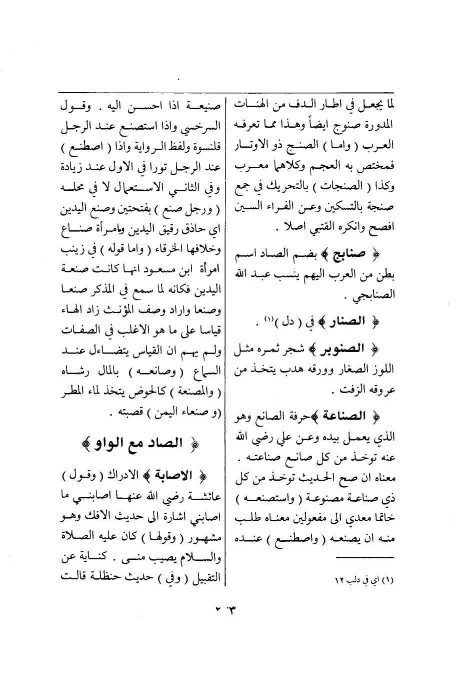 (ص ن ع) : (الصِّنَاعَةُ) حِرْفَةُ الصَّانِعِ وَهُوَ الَّذِي يَعْمَلُ بِيَدِهِ وَعَنْ عَلِيٍّ - رَضِيَ اللَّهُ عَنْهُ - تُؤْخَذُ مِنْ كُلِّ ذِي صَانِعٍ صِنَاعَتُهُ مَعْنَاهُ إنْ صَحَّ الْحَدِيثُ تُؤْخَذُ مِنْ كُلِّ ذِي صِنَاعَةٍ مَصْنُوعُهُ (وَاسْتَصْنَعَهُ) خَاتَمًا مُعَدًّى إلَى مَفْعُولَيْنِ مَعْنَاهُ طَلَبَ مِنْهُ أَنْ يَصْنَعَهُ (وَاصْطَنَعَ) عِنْدَهُ صَنِيعَةً إذَا أَحْسَنَ إلَيْهِ وَقَوْلُ السَّرَخْسِيِّ وَإِذَا اسْتَصْنَعَ عِنْدَ الرَّجُلِ قَلَنْسُوَةً وَلَفْظُ الرِّوَايَةِ وَإِذَا (اصْطَنَعَ) عِنْدَ الرَّجُلِ تَوْرًا فِي الْأَوَّلِ عِنْدَ زِيَادَةٍ وَفِي الثَّانِي الِاسْتِعْمَالُ لَا فِي مَحَلِّهِ (وَرَجُلٌ صَنَعٌ) بِفَتْحَتَيْنِ وَصَنَعُ الْيَدَيْنِ أَيْ حَاذِقٌ رَقِيقُ الْيَدَيْنِ وَامْرَأَةٌ صَنَاعٌ وَخِلَافُهَا الْخَرْقَاءُ (وَأَمَّا قَوْلُهُ) فِي زَيْنَبَ امْرَأَةِ ابْنِ مَسْعُودٍ أَنَّهَا كَانَتْ صَنَعَةُ الْيَدَيْنِ فَكَأَنَّهُ لَمَّا سَمِعَ فِي الْمُذَكَّرِ