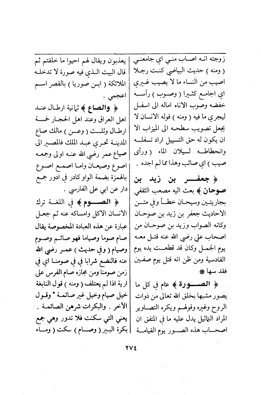 (ص وع) : (وَالصَّاعُ) ثَمَانِيَةُ أَرْطَالٍ عِنْدَ أَهْلِ الْعِرَاقِ وَعِنْدَ أَهْلِ الْحِجَازِ خَمْسَةُ أَرْطَالٍ وَثُلُثٍ (وَعَنْ) مَالِكٍ صَاعُ الْمَدِينَةِ تَحَرِّي عَبْدِ الْمَلِكِ فَالْمَصِيرُ إلَى صِيَاعِ عُمَرَ - رَضِيَ اللَّهُ عَنْهُ - أَوْلَى وَجَمْعُهُ أَصْوُعٌ وَصِيعَانٌ وَأَمَّا آصُعٌ فَقَلْبُ أَصْؤُعٍ بِالْهَمْزَةِ لِضَمَّةِ الْوَاوِ كَآدُرٍ فِي أَدْؤُرٍ جَمْعُ دَارٍ عَنْ أَبِي عَلِيٍّ الْفَارِسِيِّ.