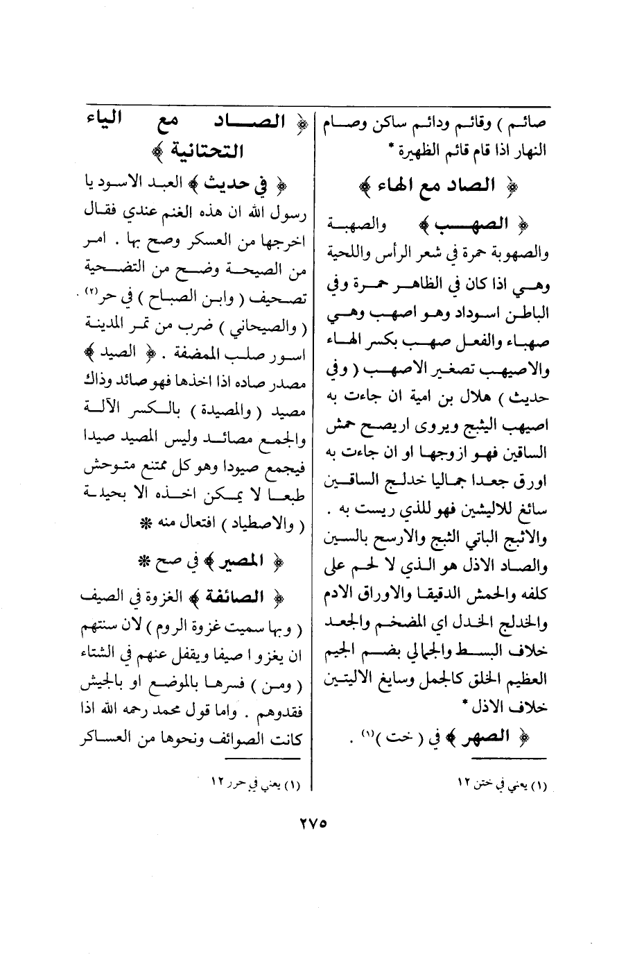 (ص ي ح) : (فِي حَدِيثِ) «الْعَبْدِ الْأَسْوَدِ يَا رَسُولَ اللَّهِ إنَّ هَذِهِ الْغَنَمَ عِنْدِي فَقَالَ أَخْرِجْهَا مِنْ الْعَسْكَرِ وَصِحْ بِهَا» أَمْرٌ مِنْ الصَّيْحَةِ وَضَحِّ مِنْ التَّضْحِيَةِ تَصْحِيفٌ (وَابْنُ الصَّيَّاحِ) فِي ح ر (وَالصَّيْحَانِيُّ) ضَرْبٌ مِنْ تَمْرِ الْمَدِينَةِ أَسْوَدُ صُلْبُ الْمَمْضَغَة.